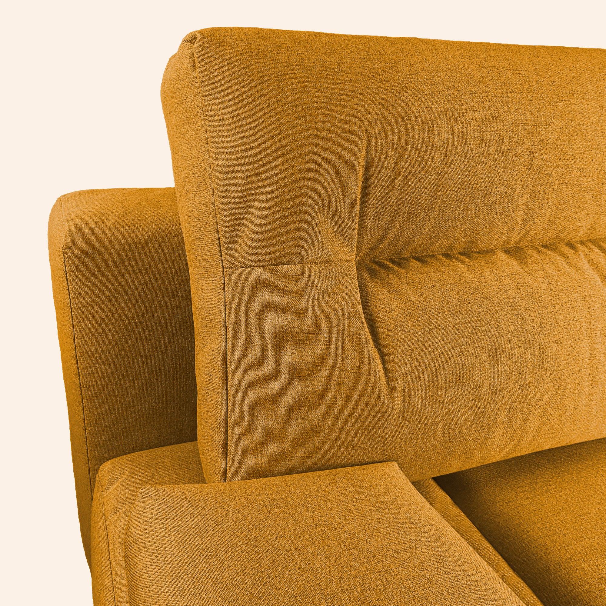 Il rivestimento in tessuto dona un tocco di calore e originalità, rendendolo un elemento d’arredo distintivo. I cuscini di seduta e schienale, con leggere impunture decorative, garantiscono un comfort elevato sia nella modalità divano che in quella letto.