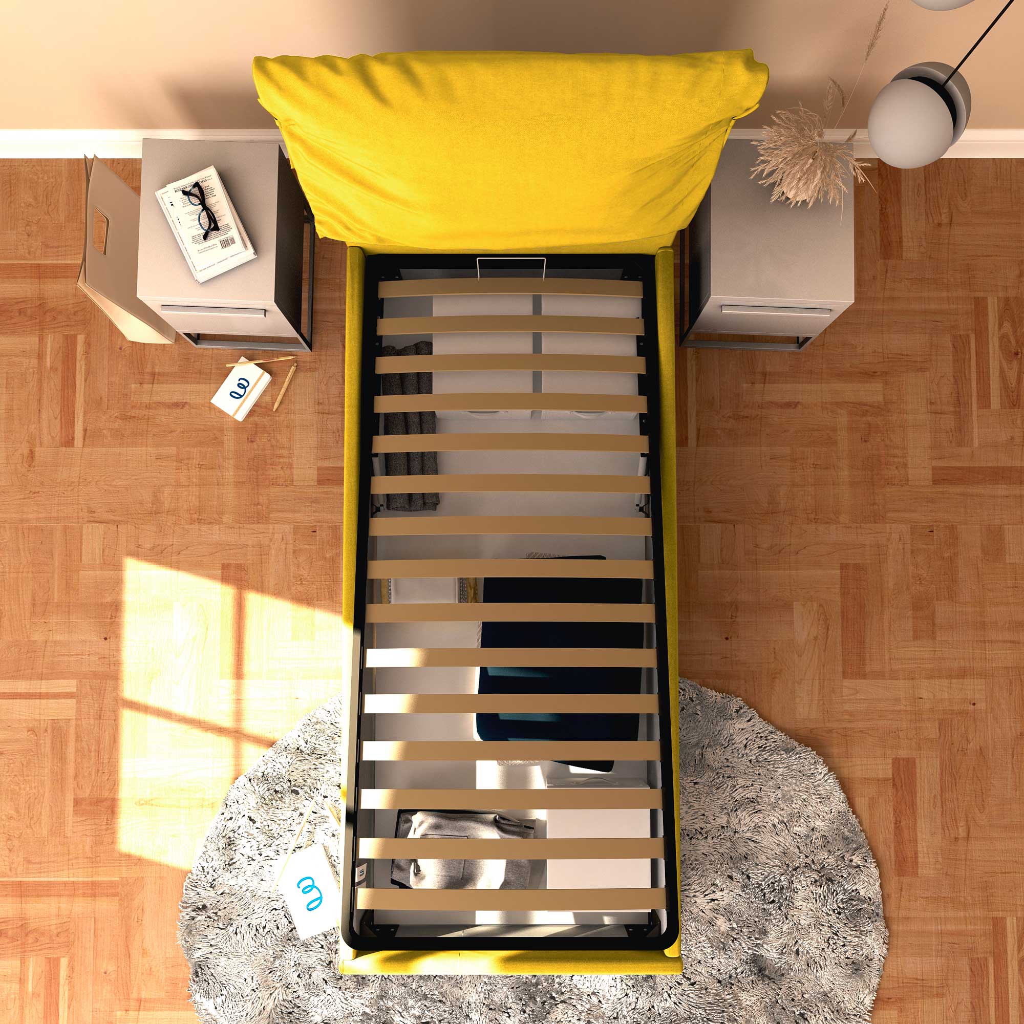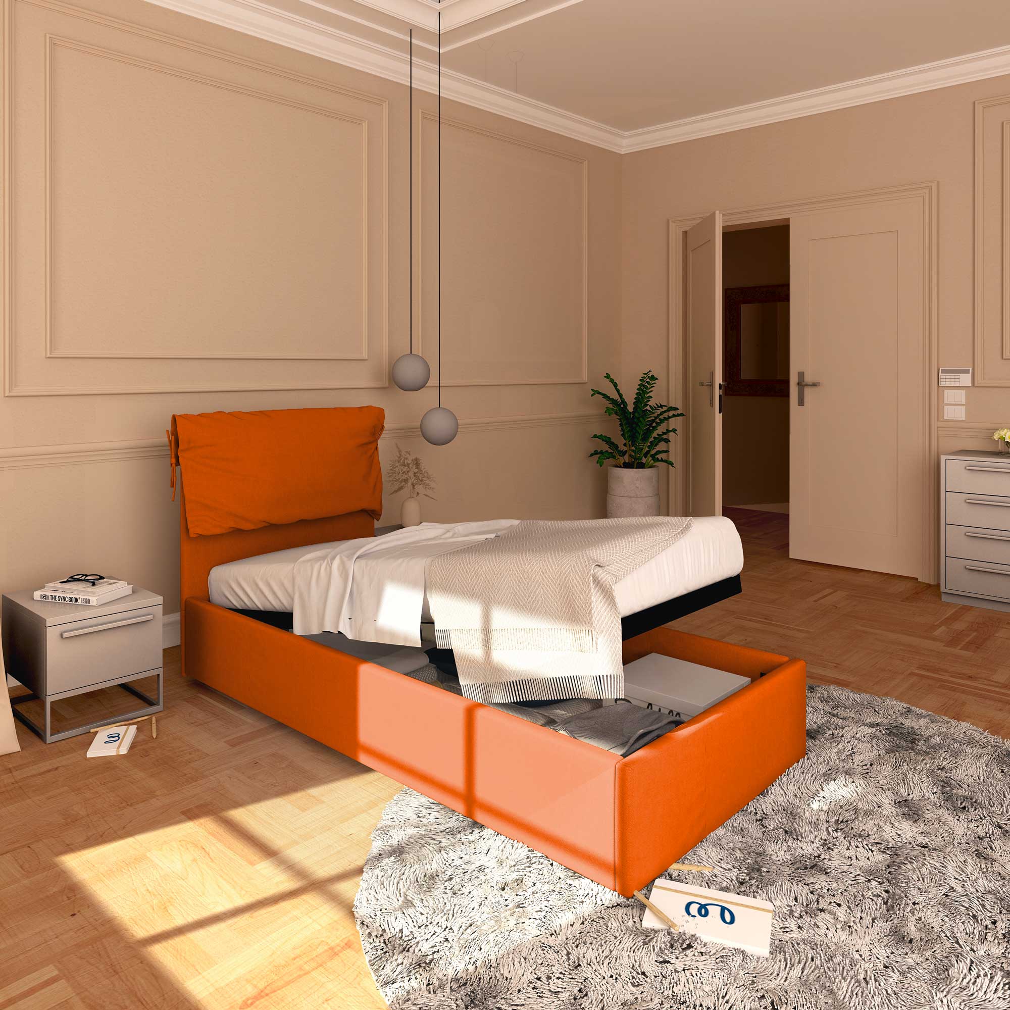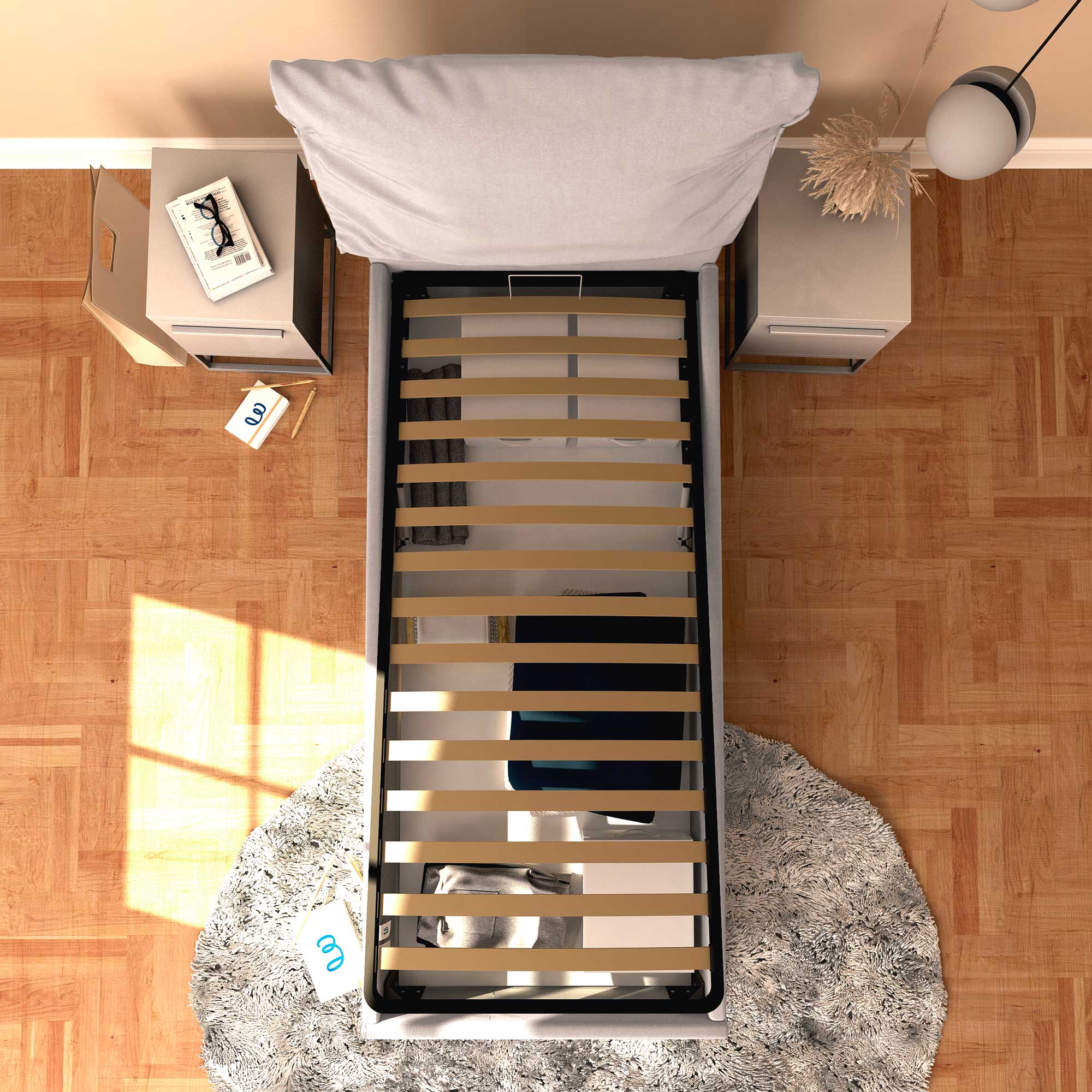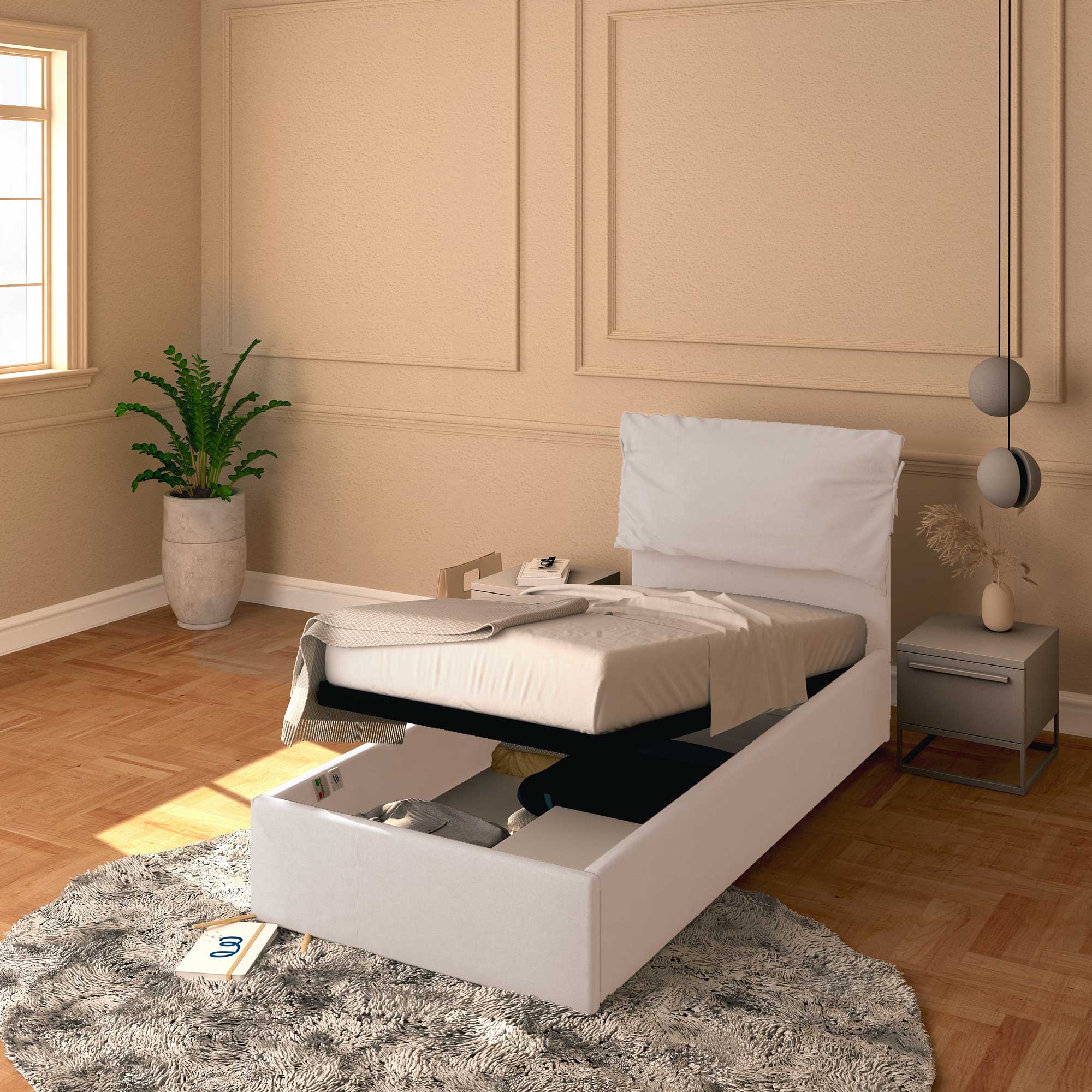 Il letto contenitore singolo in tessuto sfoderabile Licia Soft permette di sfruttare lo spazio sotto al letto per riporre coperte, lenzuola, piumoni, abiti e scatole. La rete e il materasso si sollevano agevolmente attraverso la maniglia di presa. Il letto contenitore arriva a casa da montare, corredato di semplici istruzioni da seguire.