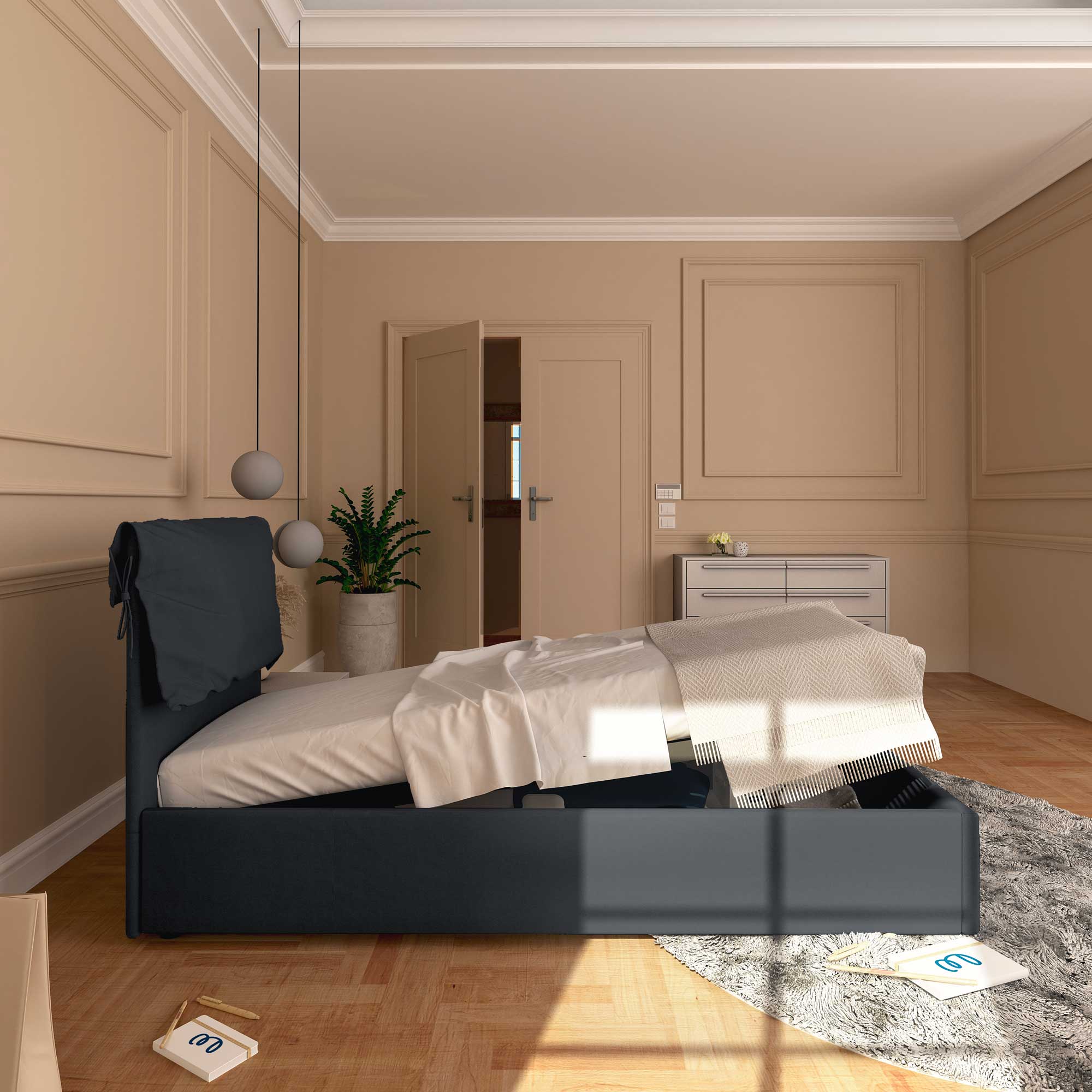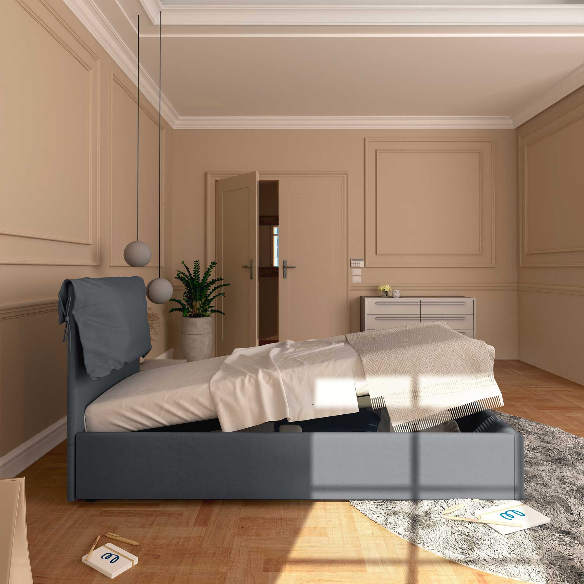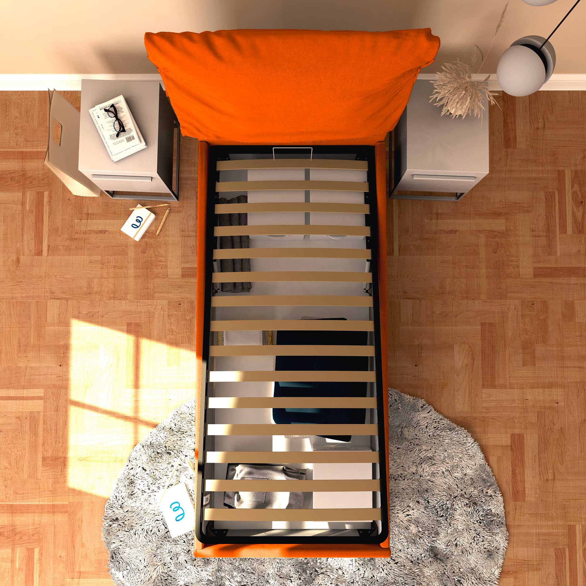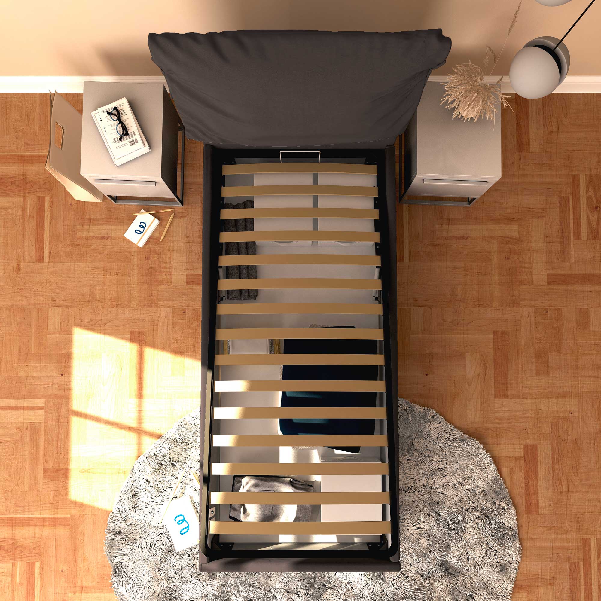 Il letto contenitore singolo in tessuto sfoderabile Licia Soft permette di sfruttare lo spazio sotto al letto per riporre coperte, lenzuola, piumoni, abiti e scatole. La rete e il materasso si sollevano agevolmente attraverso la maniglia di presa. Il letto contenitore arriva a casa da montare, corredato di semplici istruzioni da seguire.