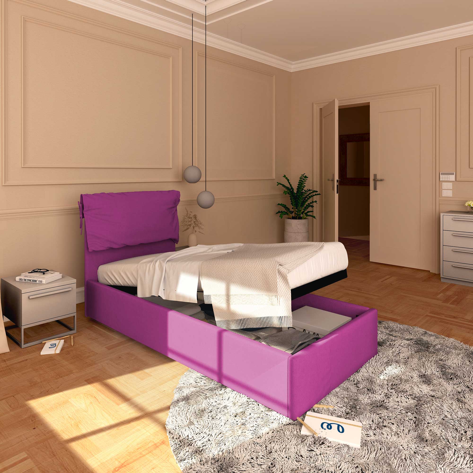 • Letto contenitore singolo in tessuto sfoderabile viola Licia Soft Baldiflex fronte