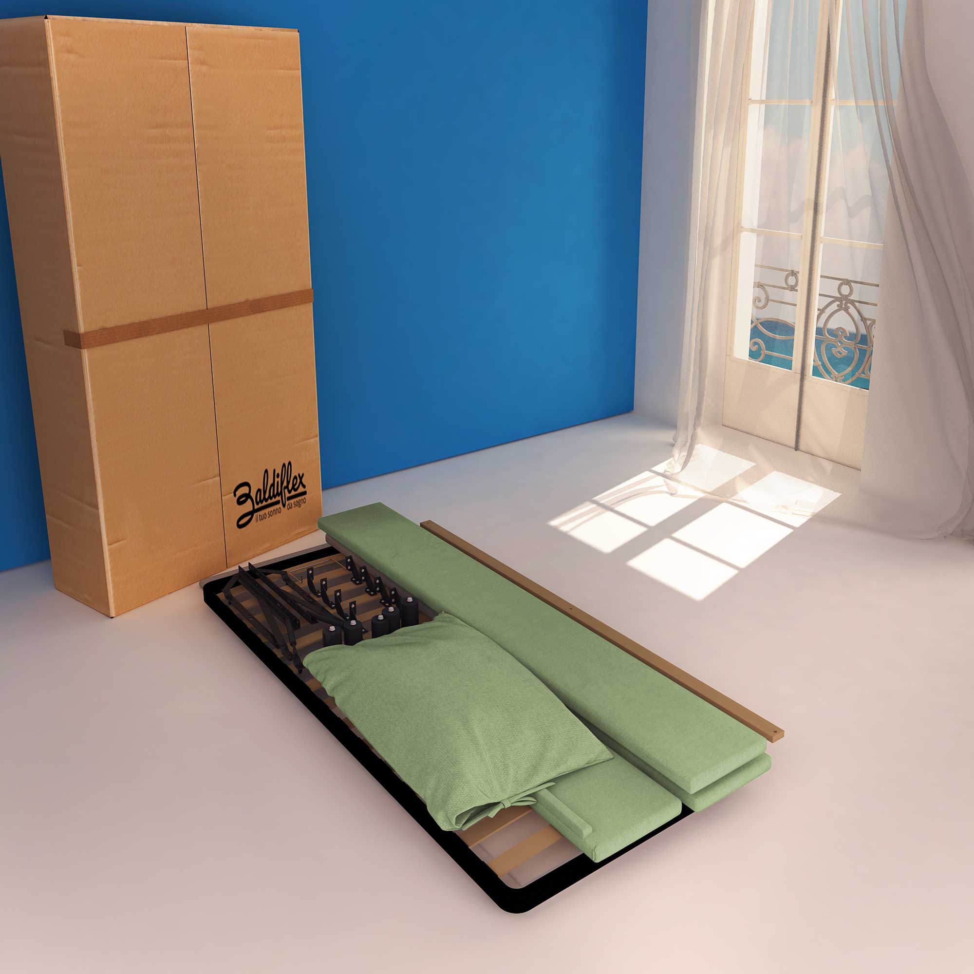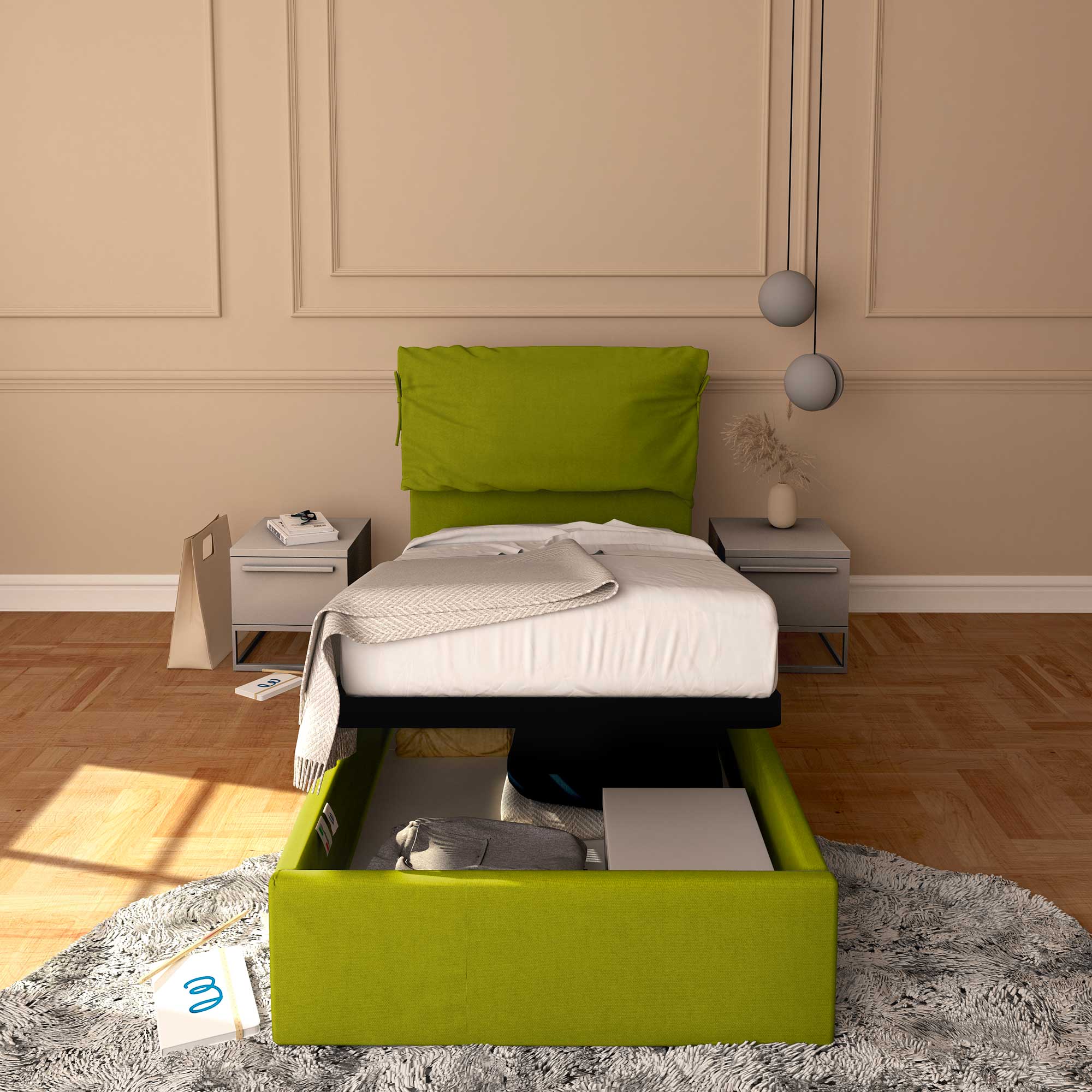 • Letto contenitore singolo in tessuto sfoderabile verde menta Licia Soft Baldiflex cartone