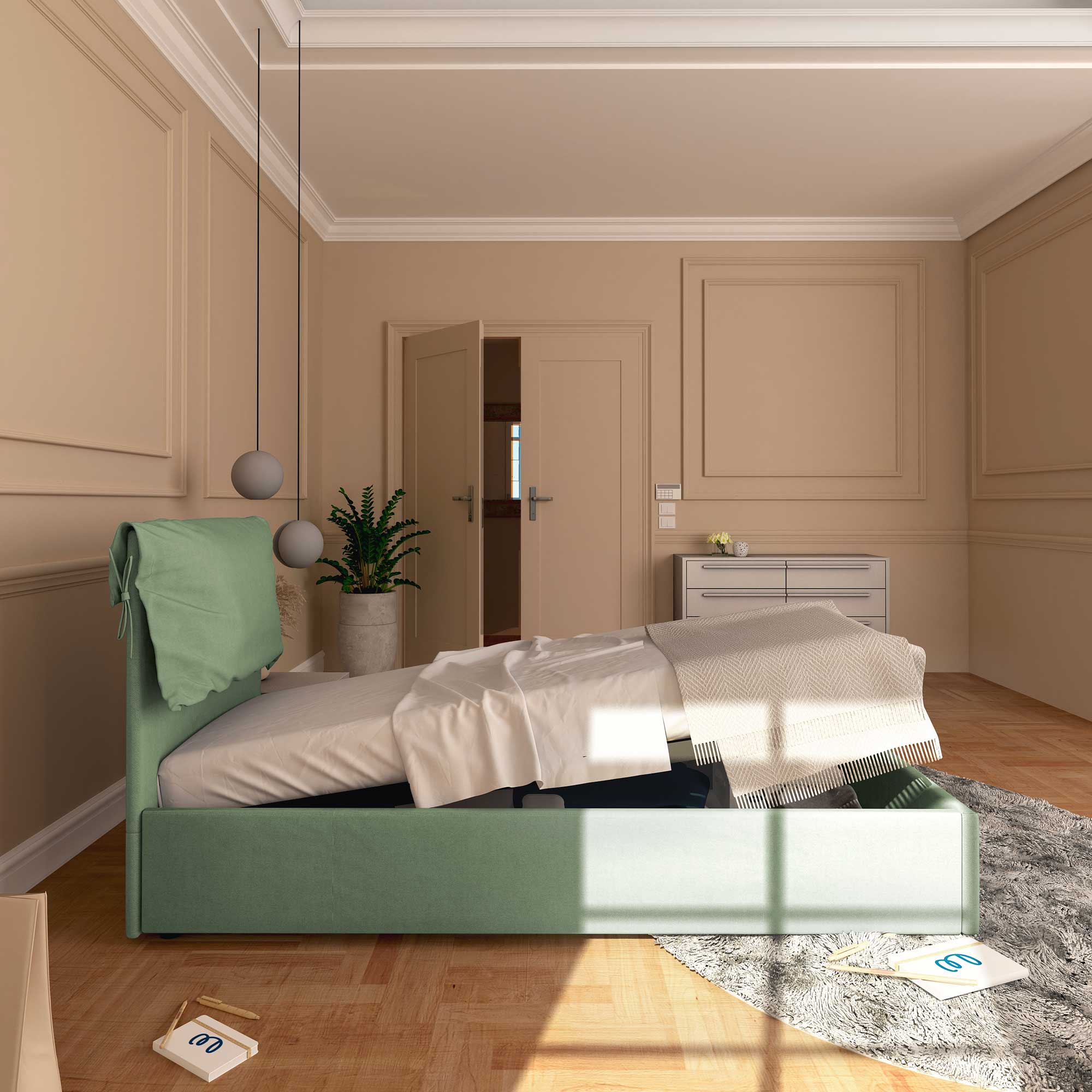 • Letto contenitore singolo in tessuto sfoderabile verde menta Licia Soft Baldiflex lato
