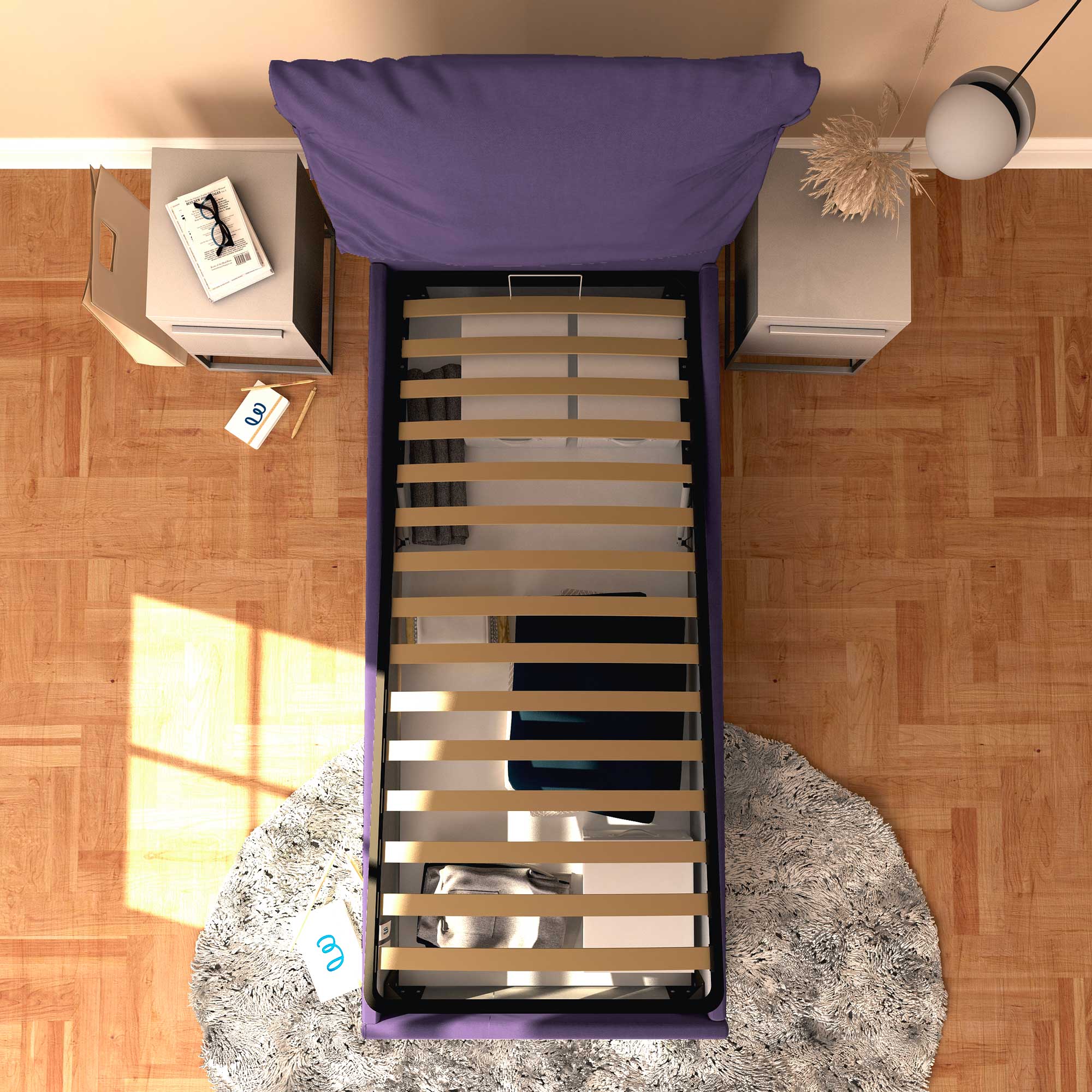 • Letto contenitore singolo in tessuto sfoderabile viola Licia Soft Baldiflex dall'alto