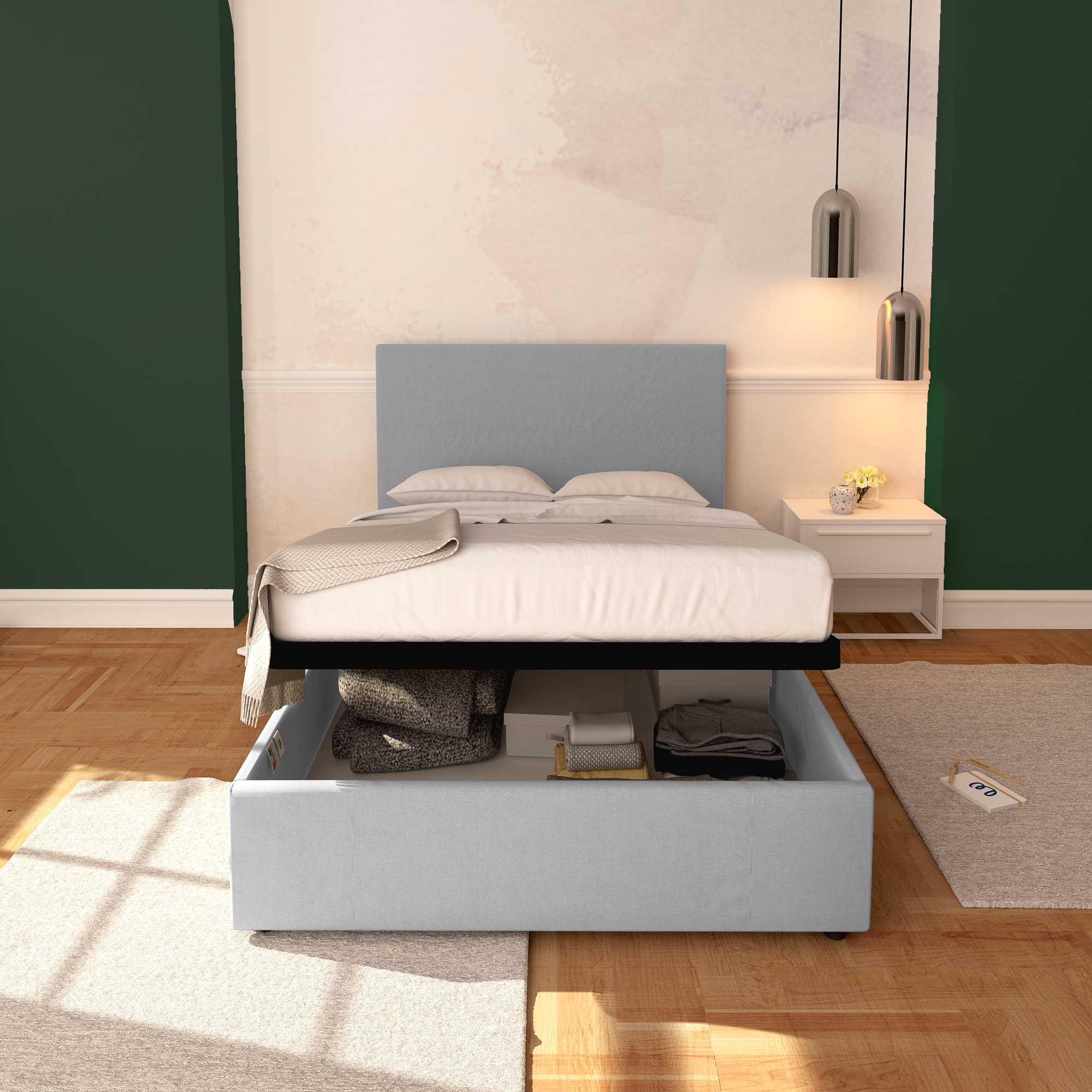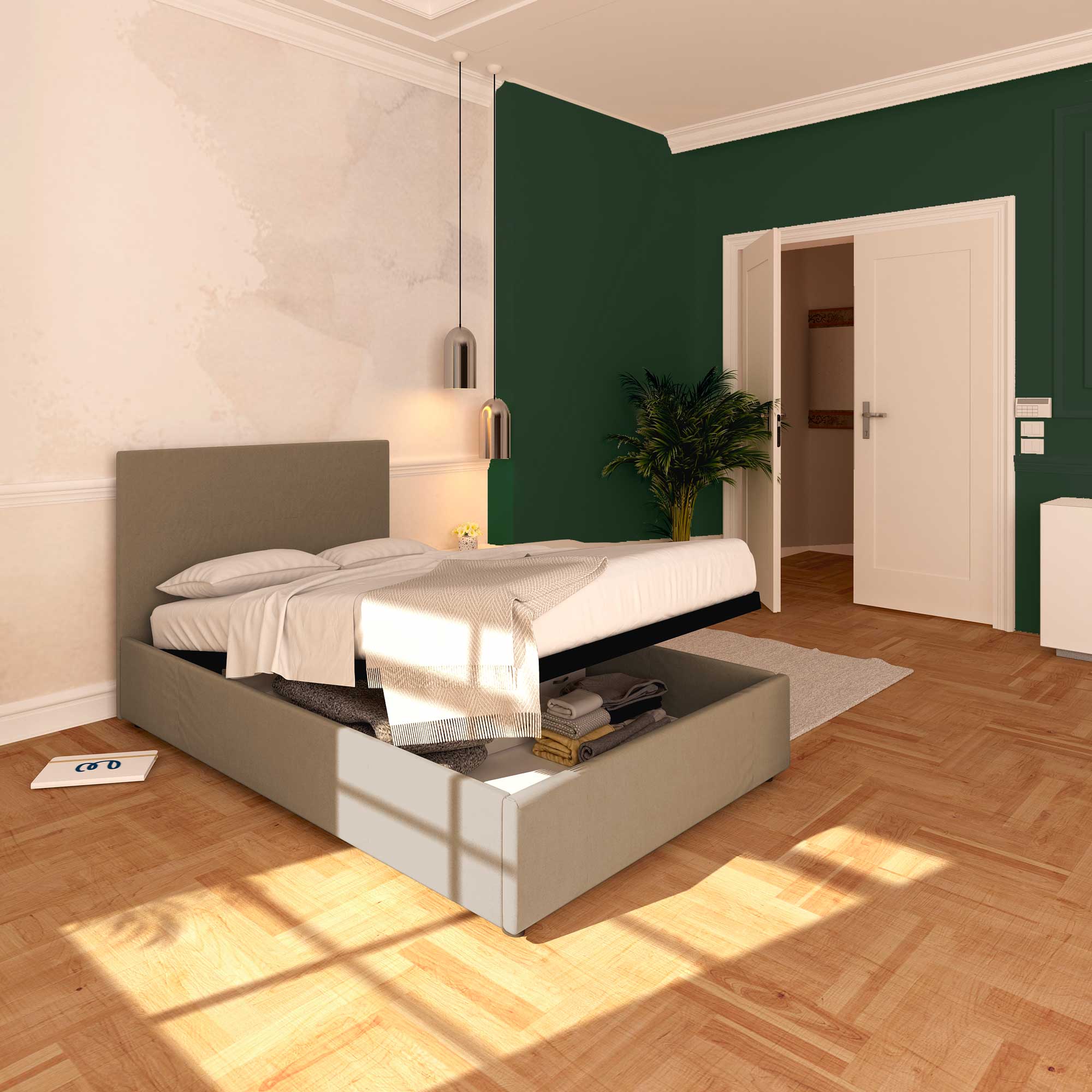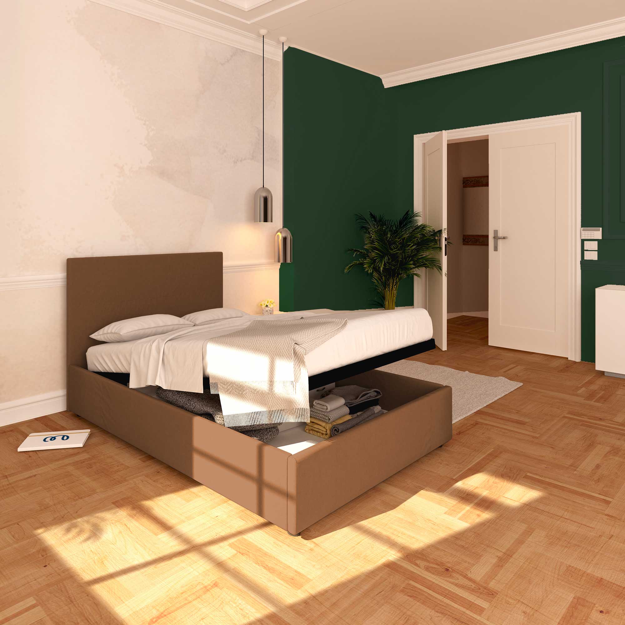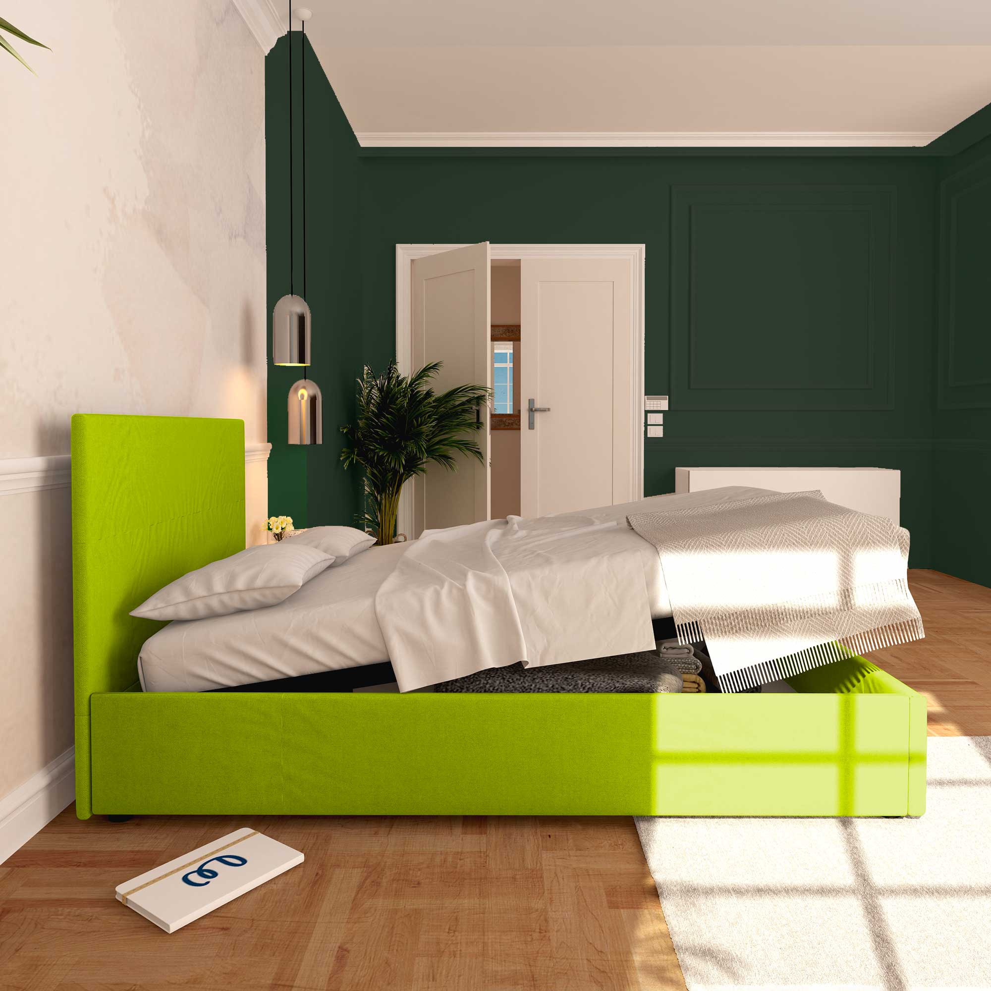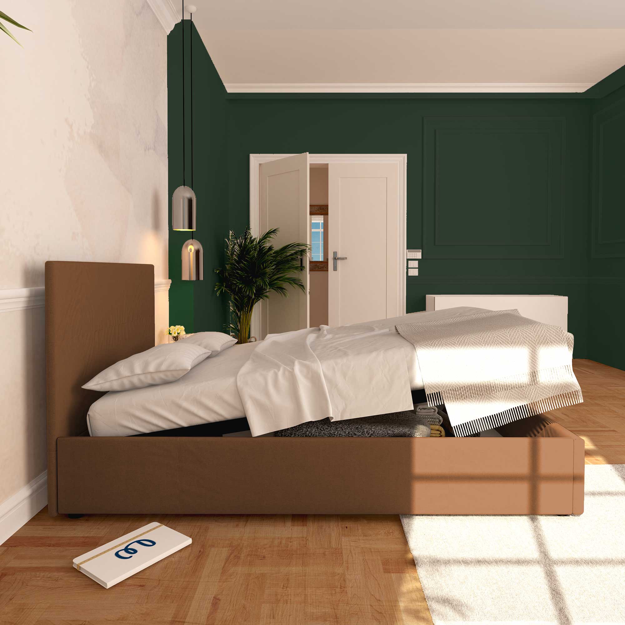 The Rossano eco-leather removable cover one-and-a-half storage bed allows you to use the space under the bed to store blankets, sheets, duvets, clothes, and boxes. The bed base and mattress lift easily via the handle. The storage bed arrives at home to be assembled, accompanied by simple instructions to follow.