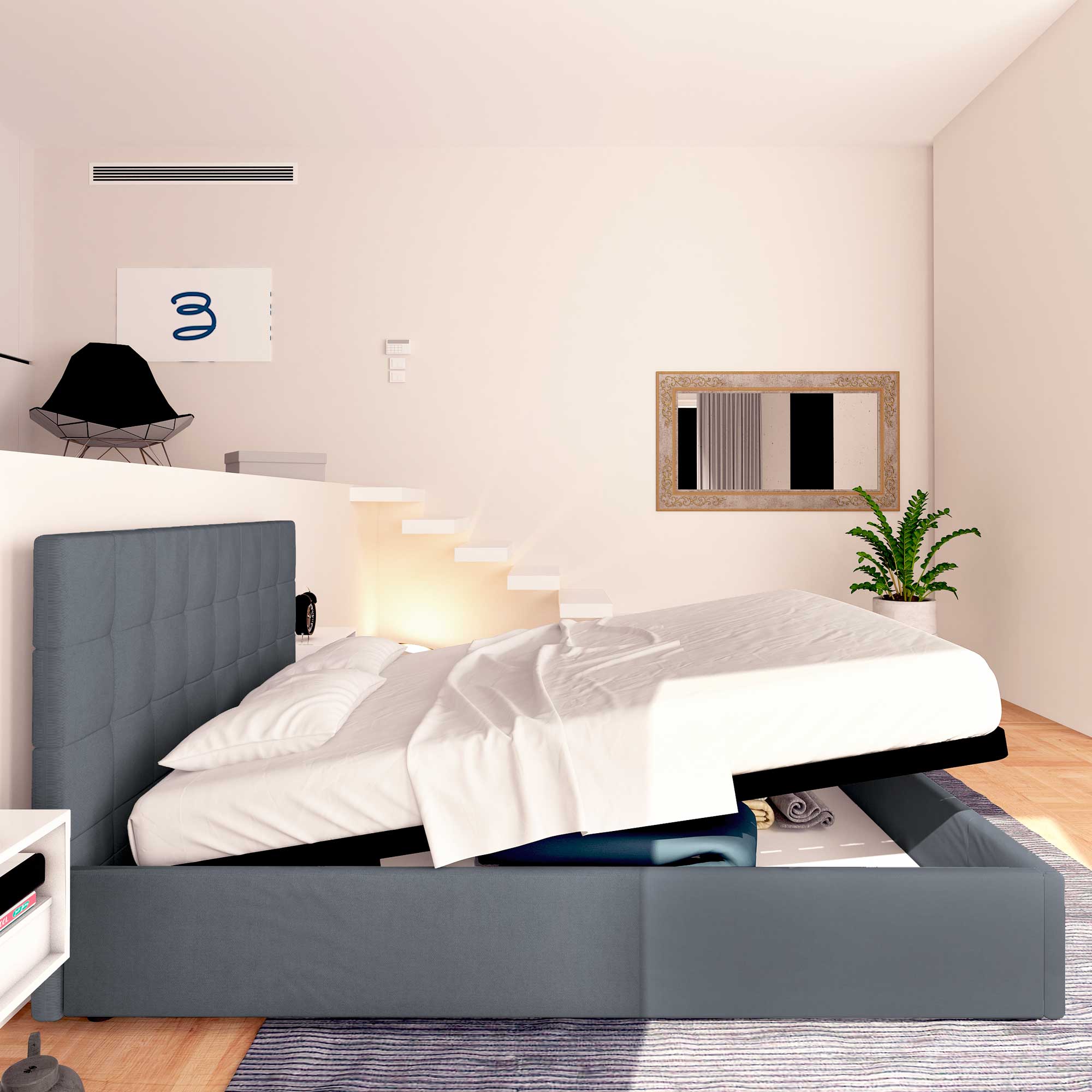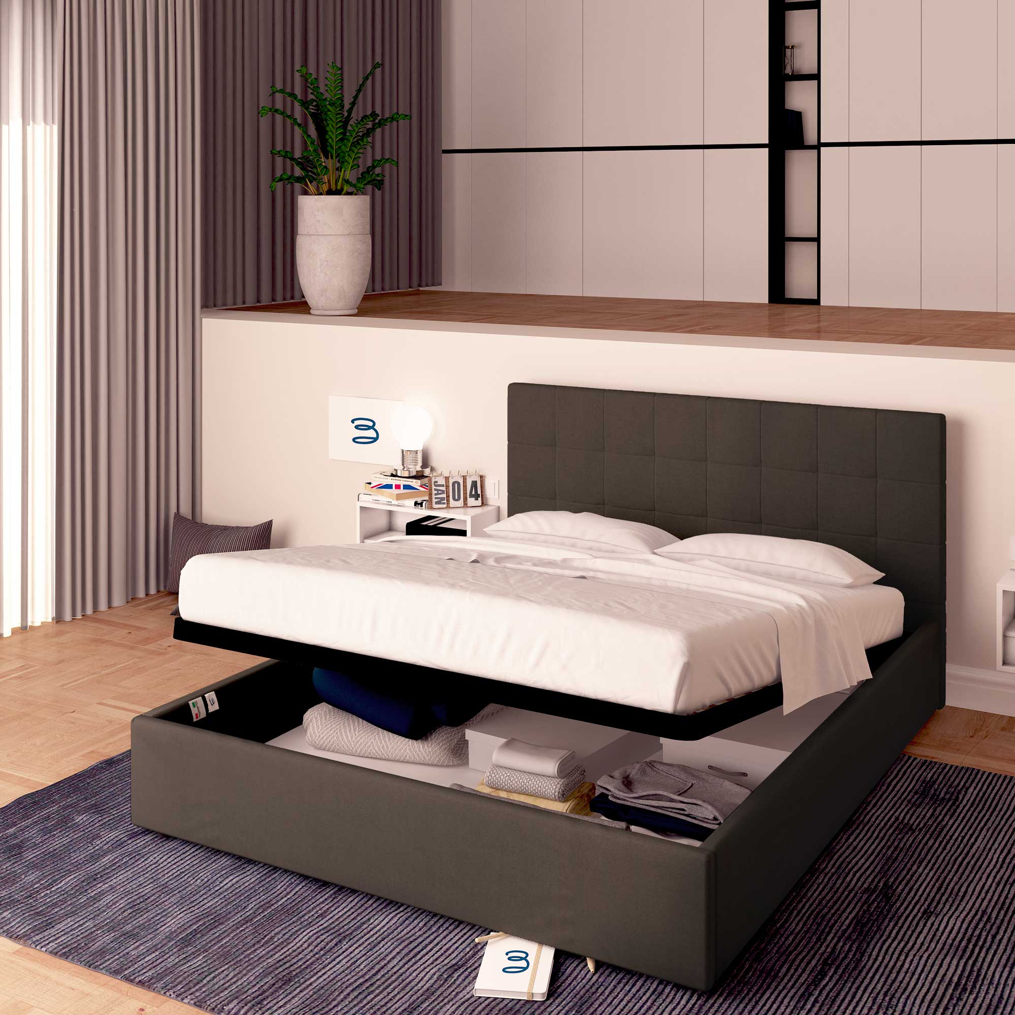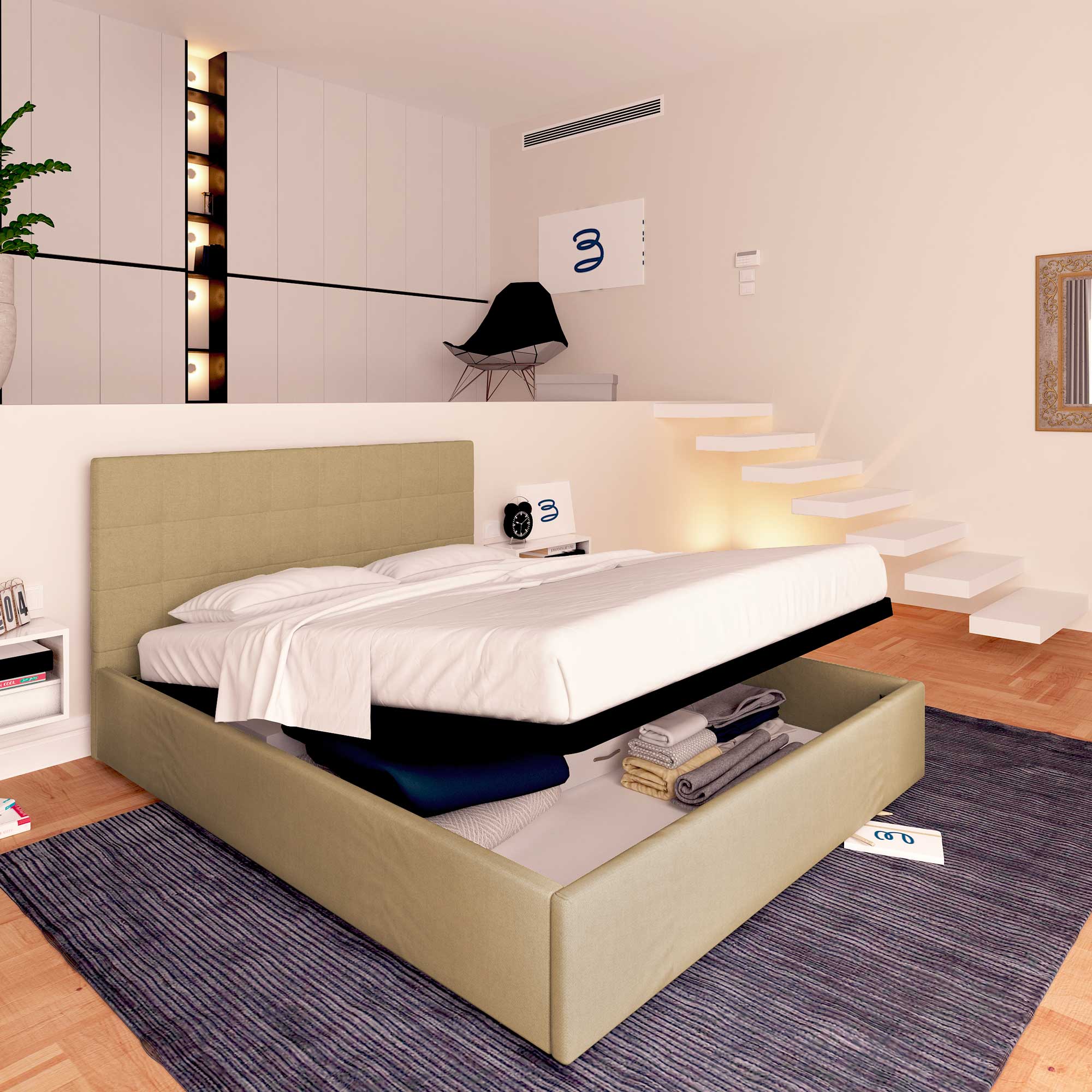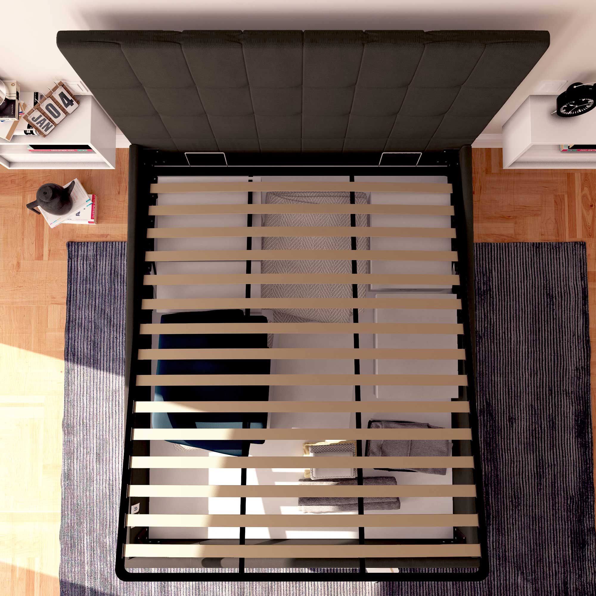 The one-and-a-half size storage bed in Dublin fabric allows you to use the space under the bed to store blankets, sheets, duvets, clothes, and boxes. The bed base and mattress lift easily via the handle. The storage bed arrives at home to be assembled, accompanied by simple instructions to follow.