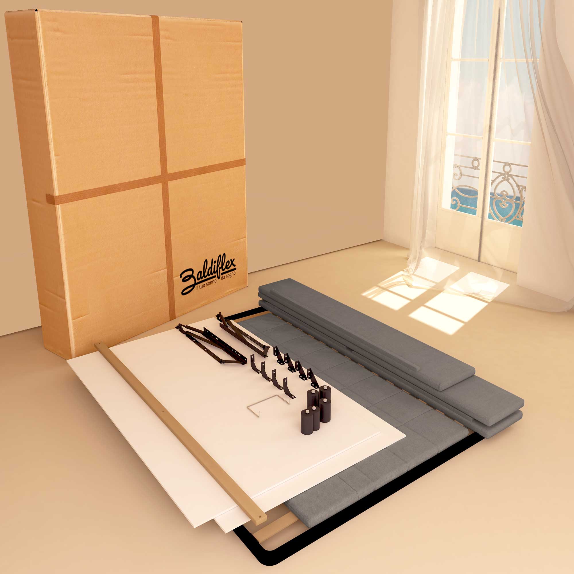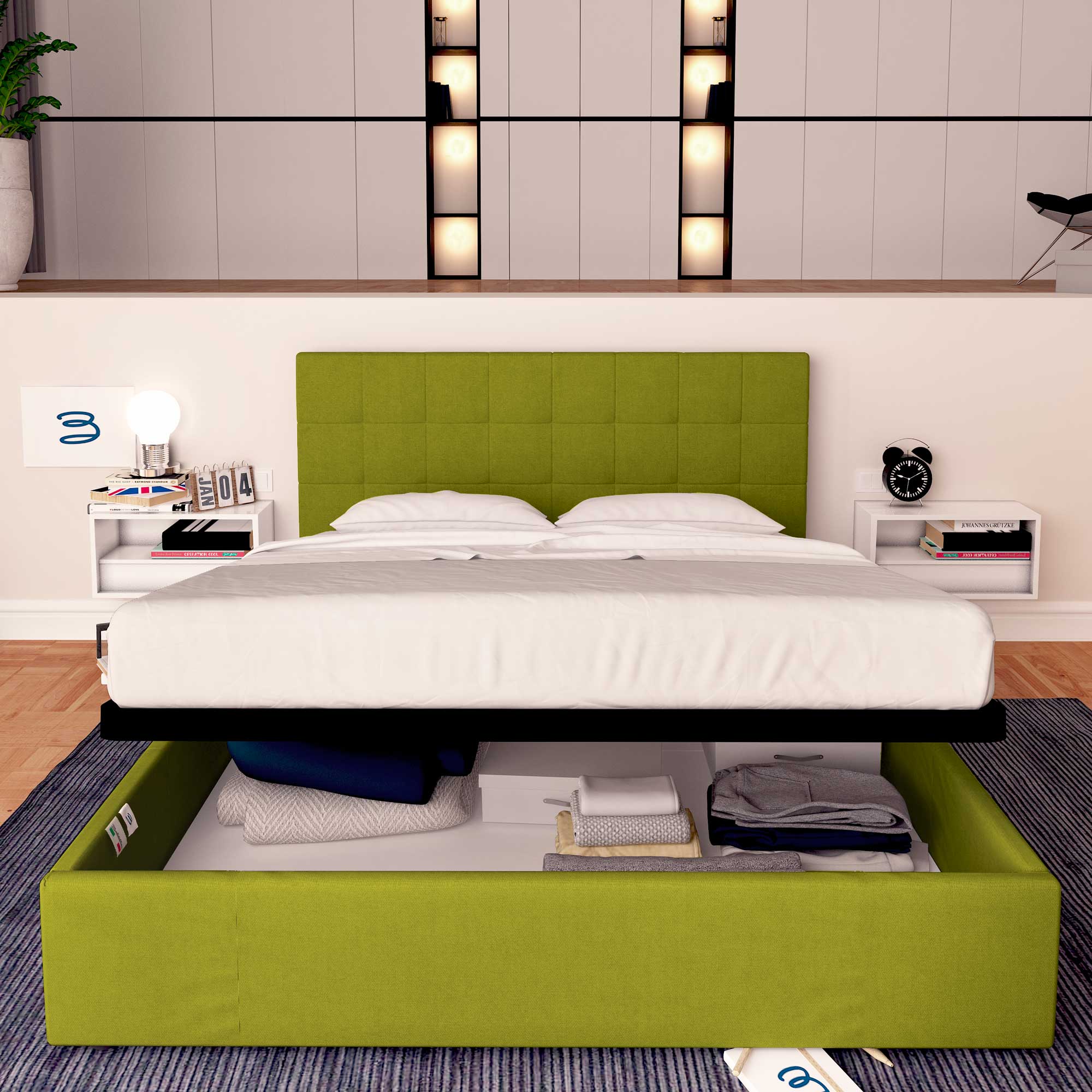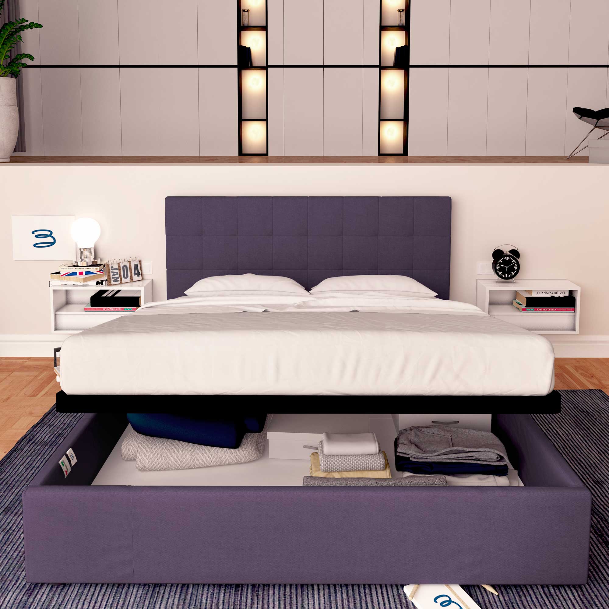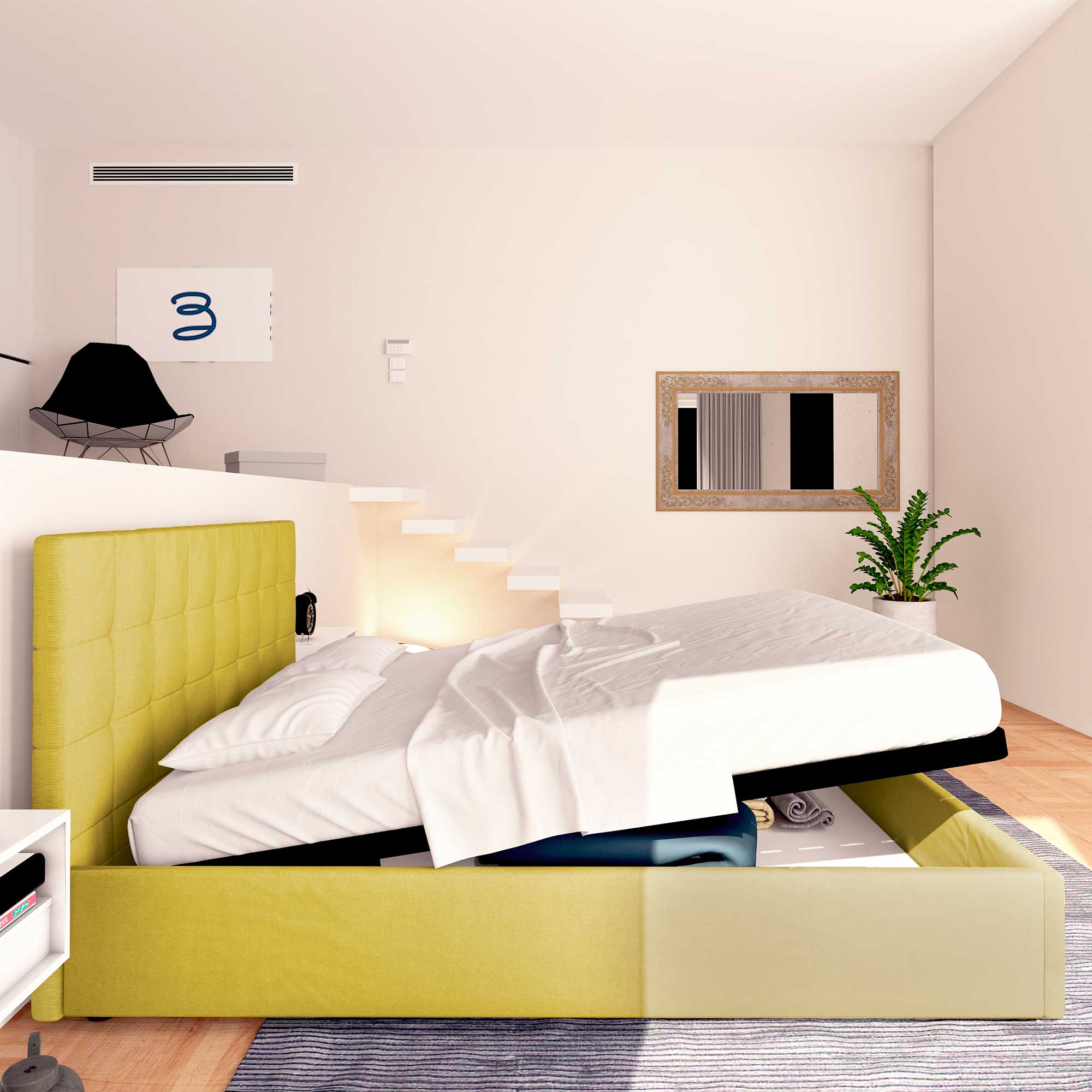 The one-and-a-half size storage bed in Dublin fabric allows you to use the space under the bed to store blankets, sheets, duvets, clothes, and boxes. The bed base and mattress lift easily via the handle. The storage bed arrives at home to be assembled, accompanied by simple instructions to follow.
