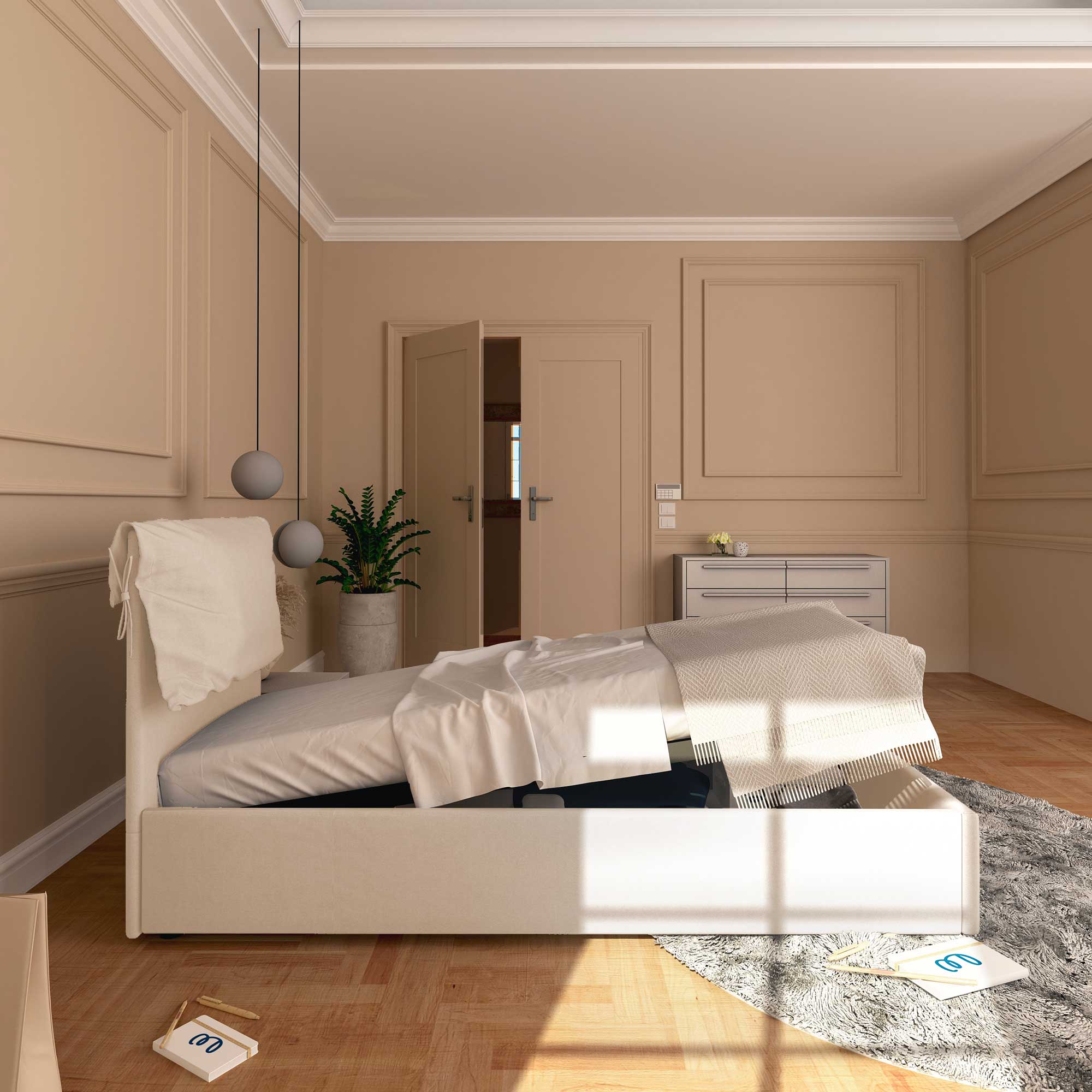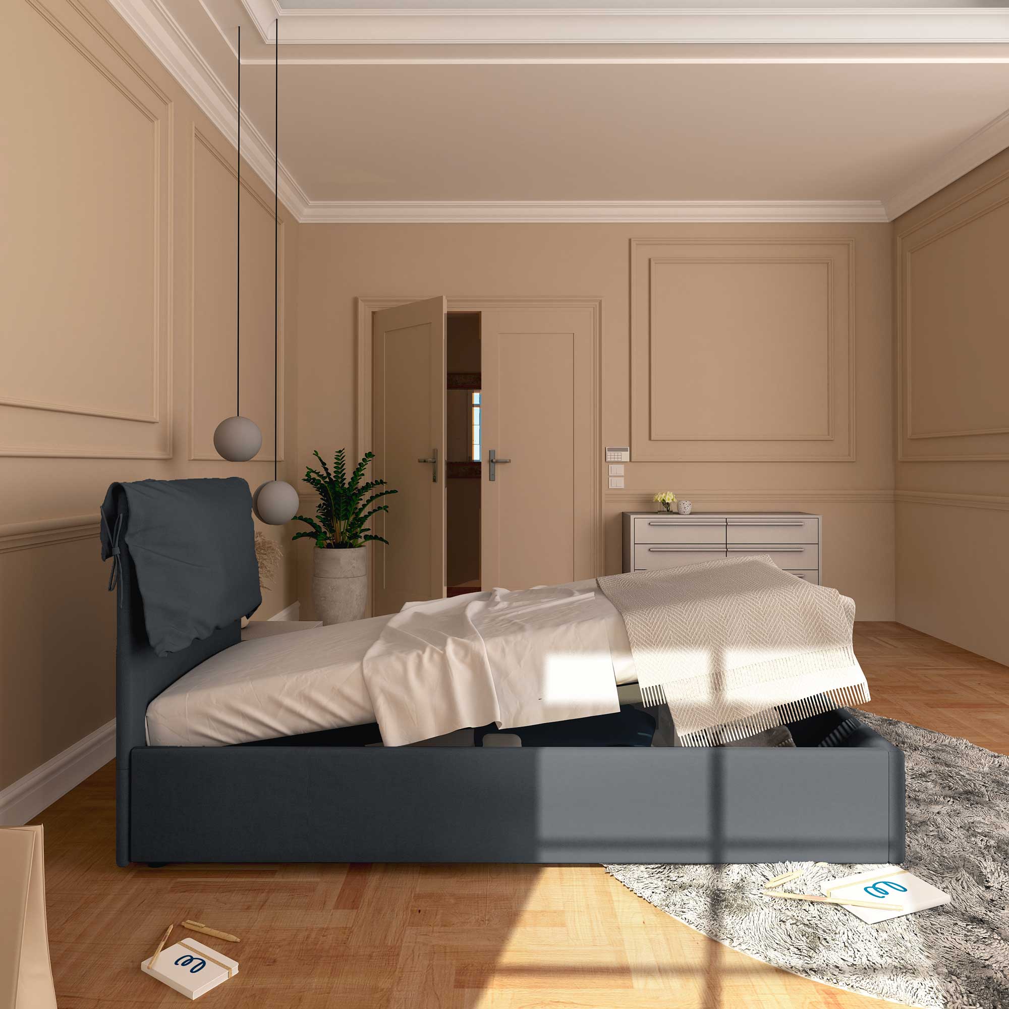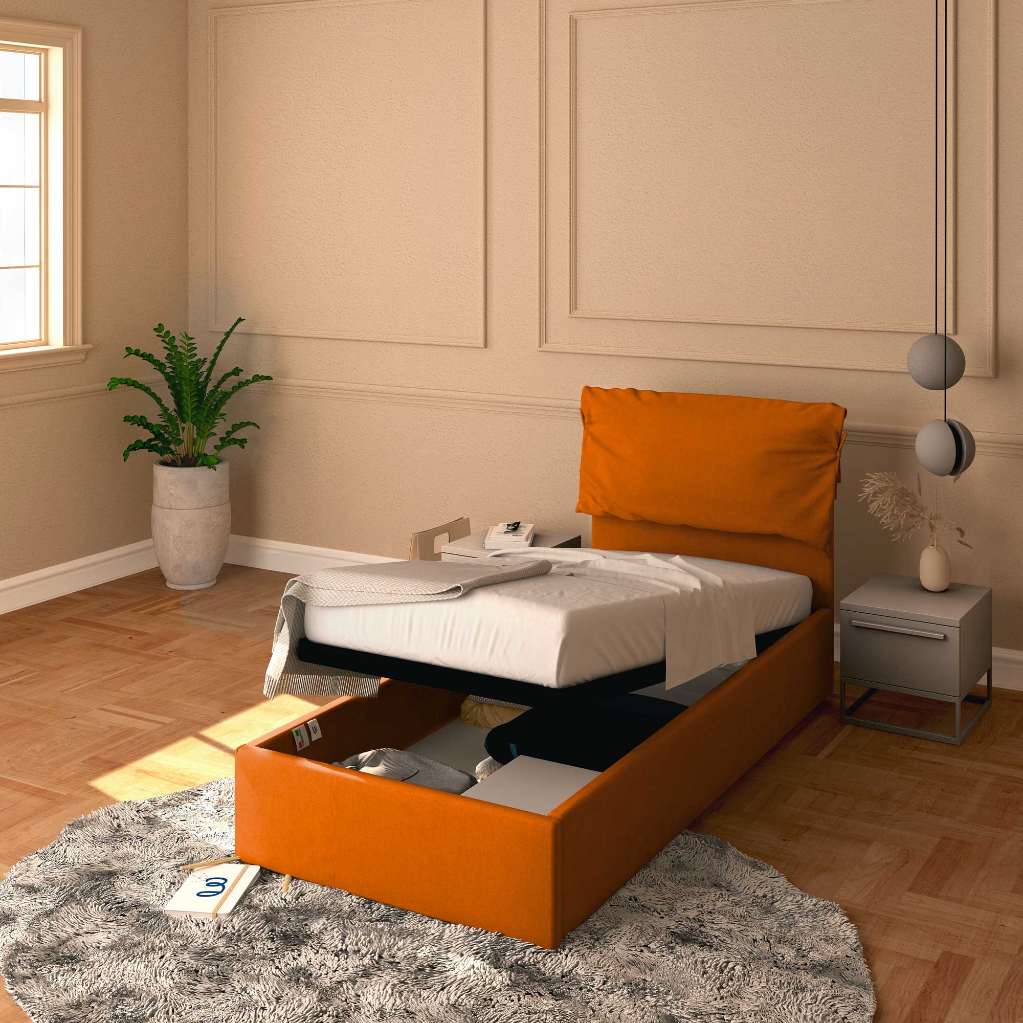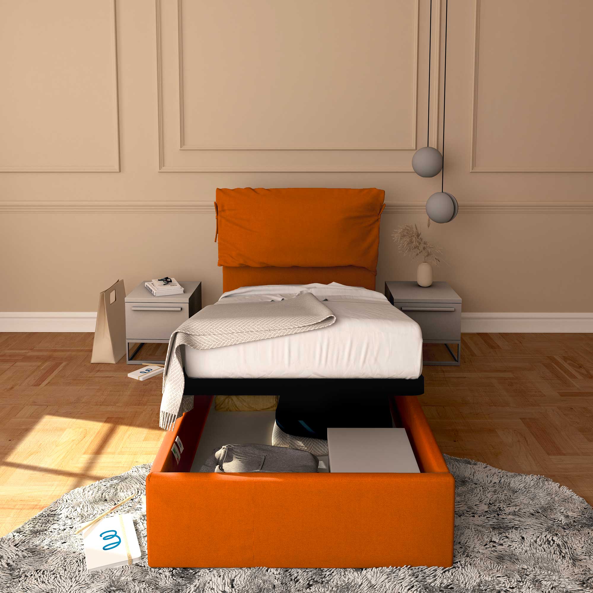 The single storage bed in removable eco-leather Licia Soft allows you to use the space under the bed to store blankets, sheets, duvets, clothes, and boxes. The bed base and mattress lift easily via the handle. The storage bed arrives at home to be assembled, accompanied by simple instructions to follow.