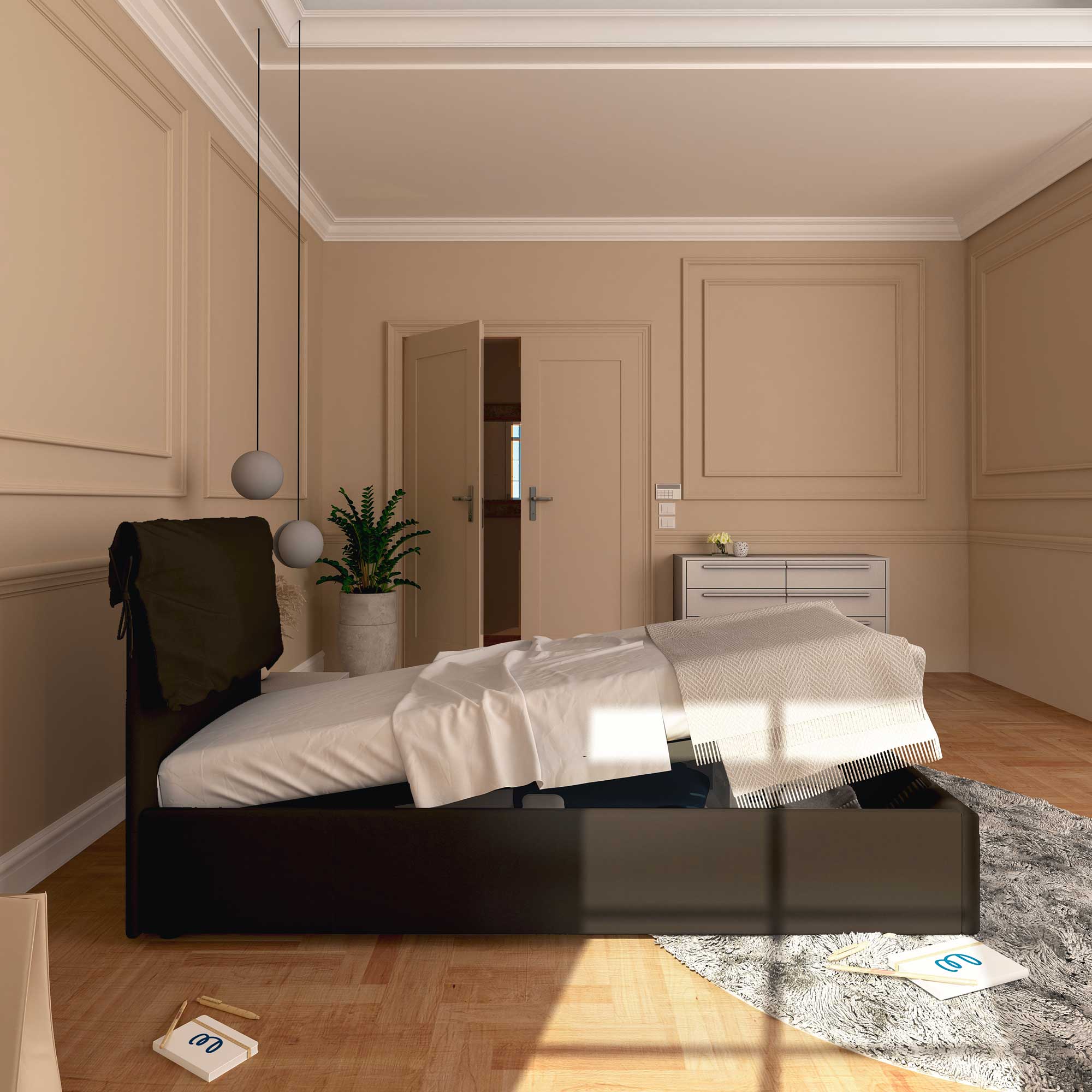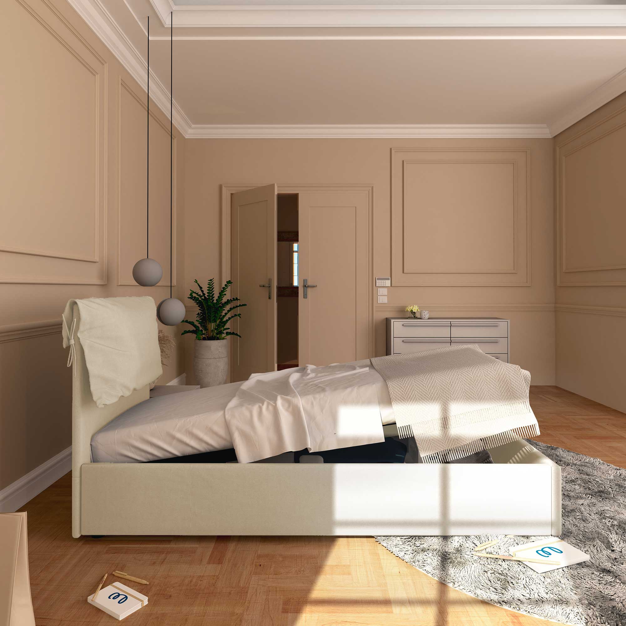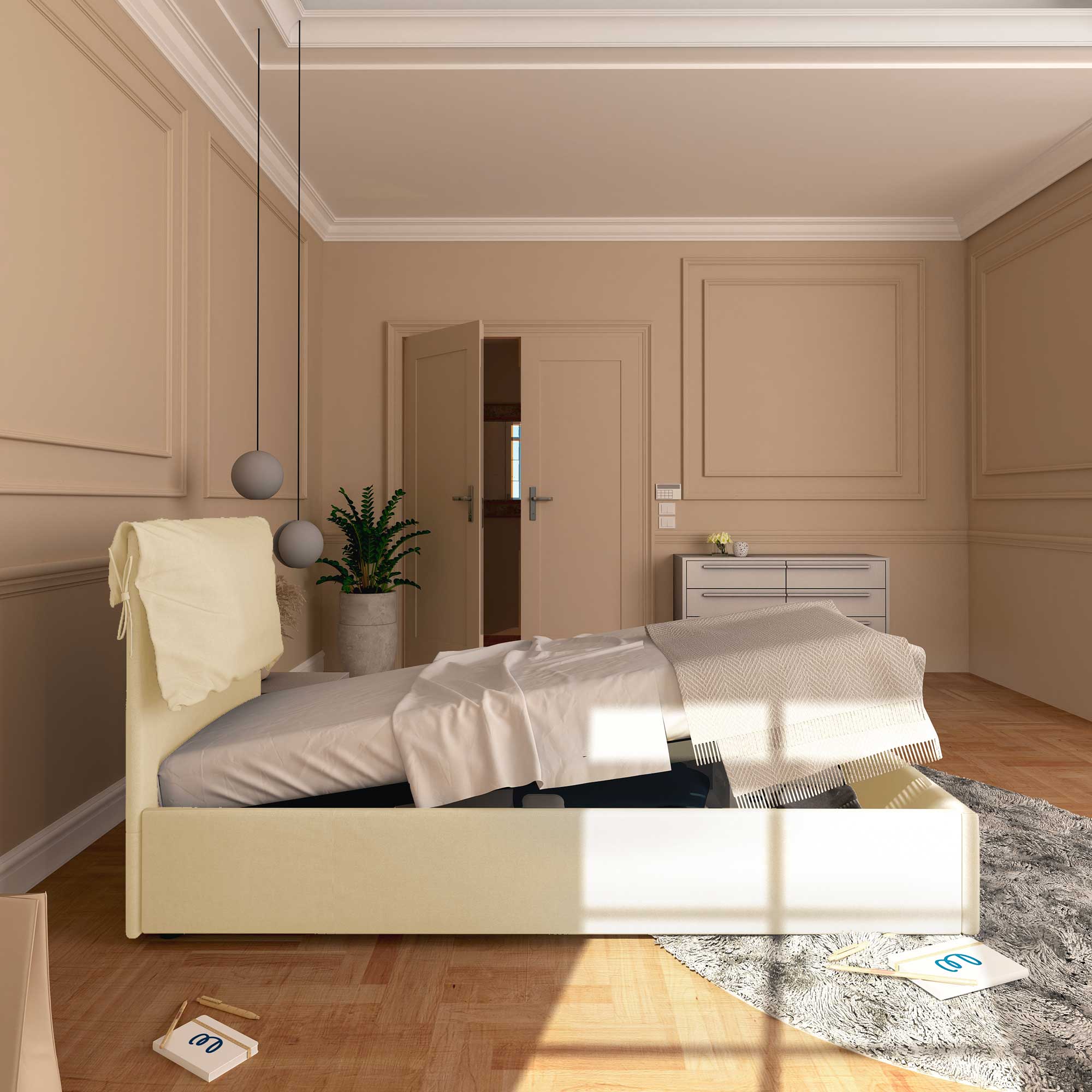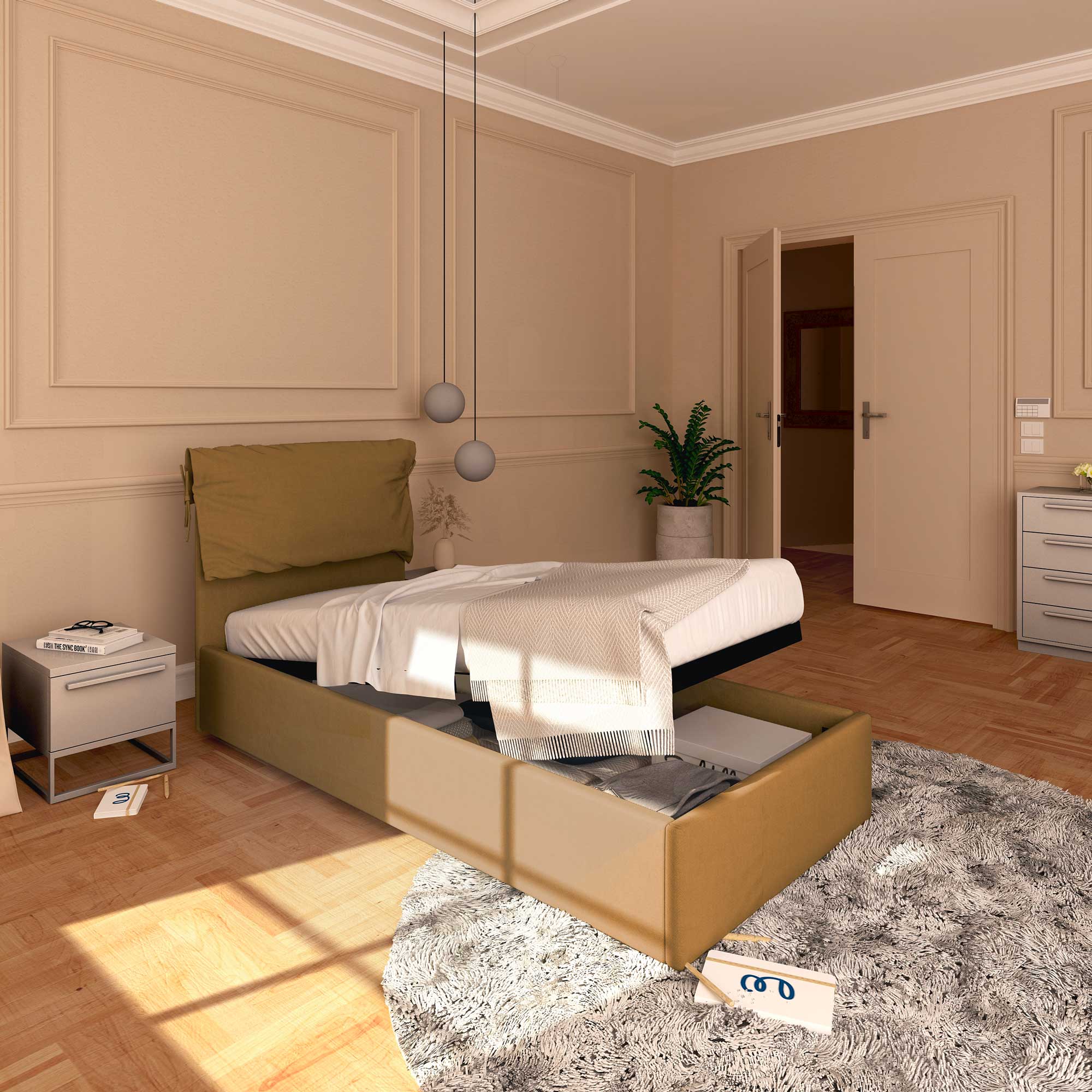 The single storage bed in removable eco-leather Licia Soft allows you to use the space under the bed to store blankets, sheets, duvets, clothes, and boxes. The bed base and mattress lift easily via the handle. The storage bed arrives at home to be assembled, accompanied by simple instructions to follow.