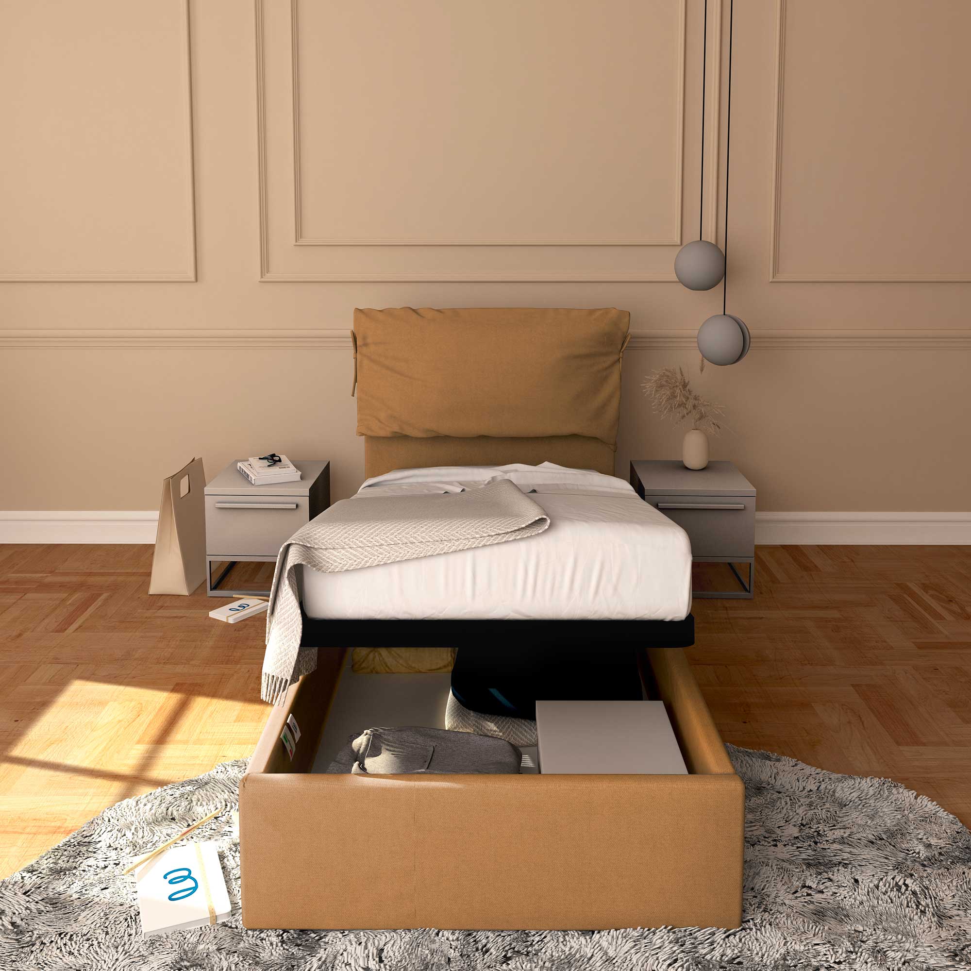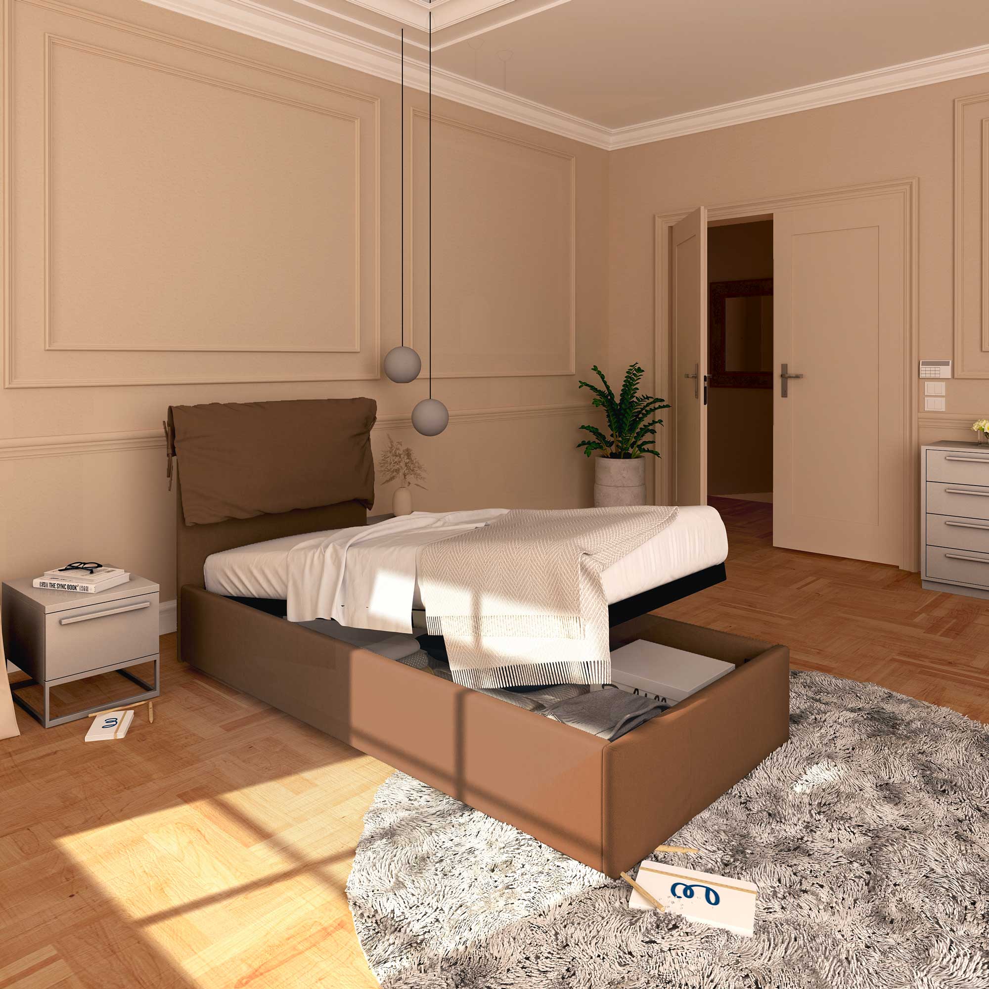 • Letto contenitore singolo in ecopelle sfoderabile nocciola Baldiflex Licia Soft lato