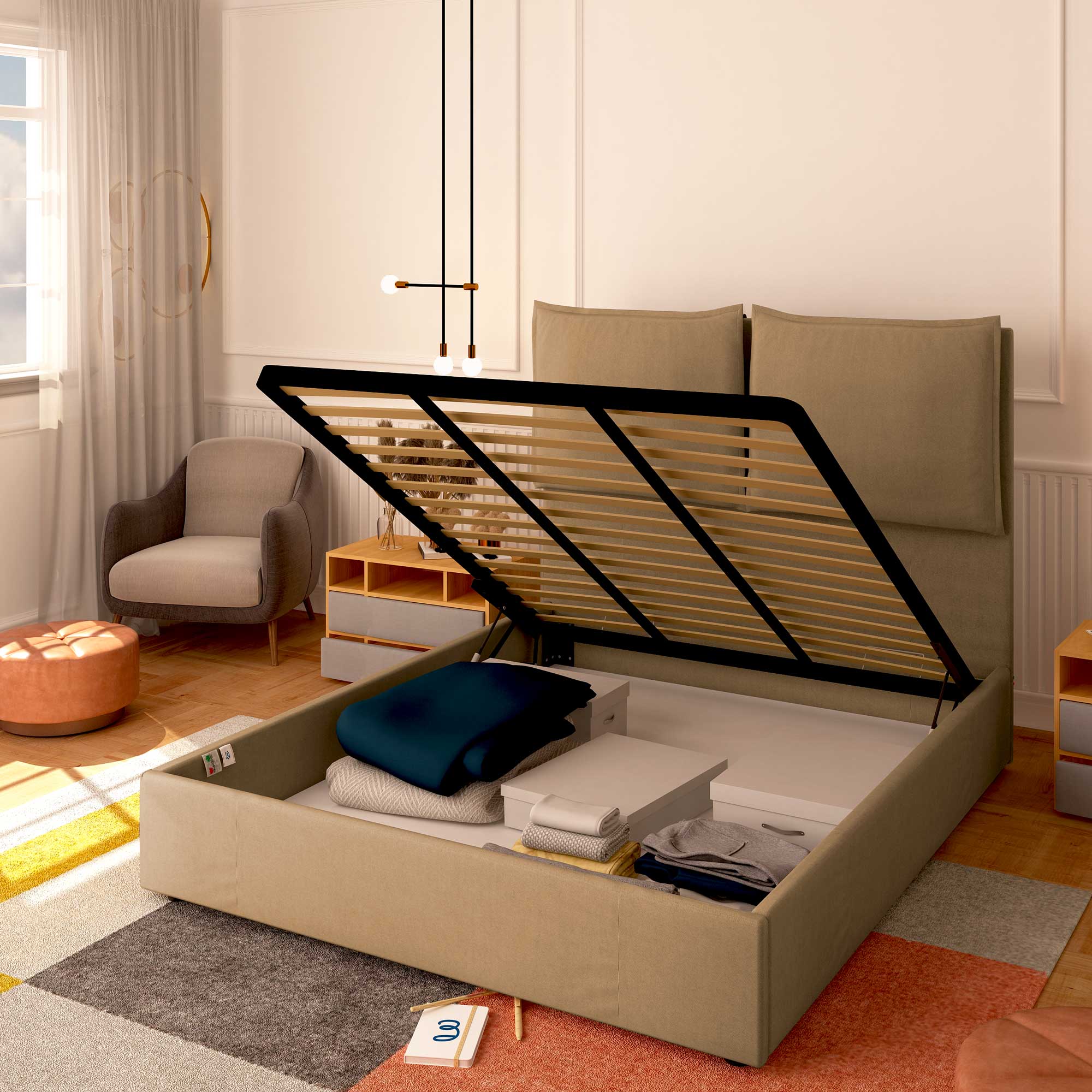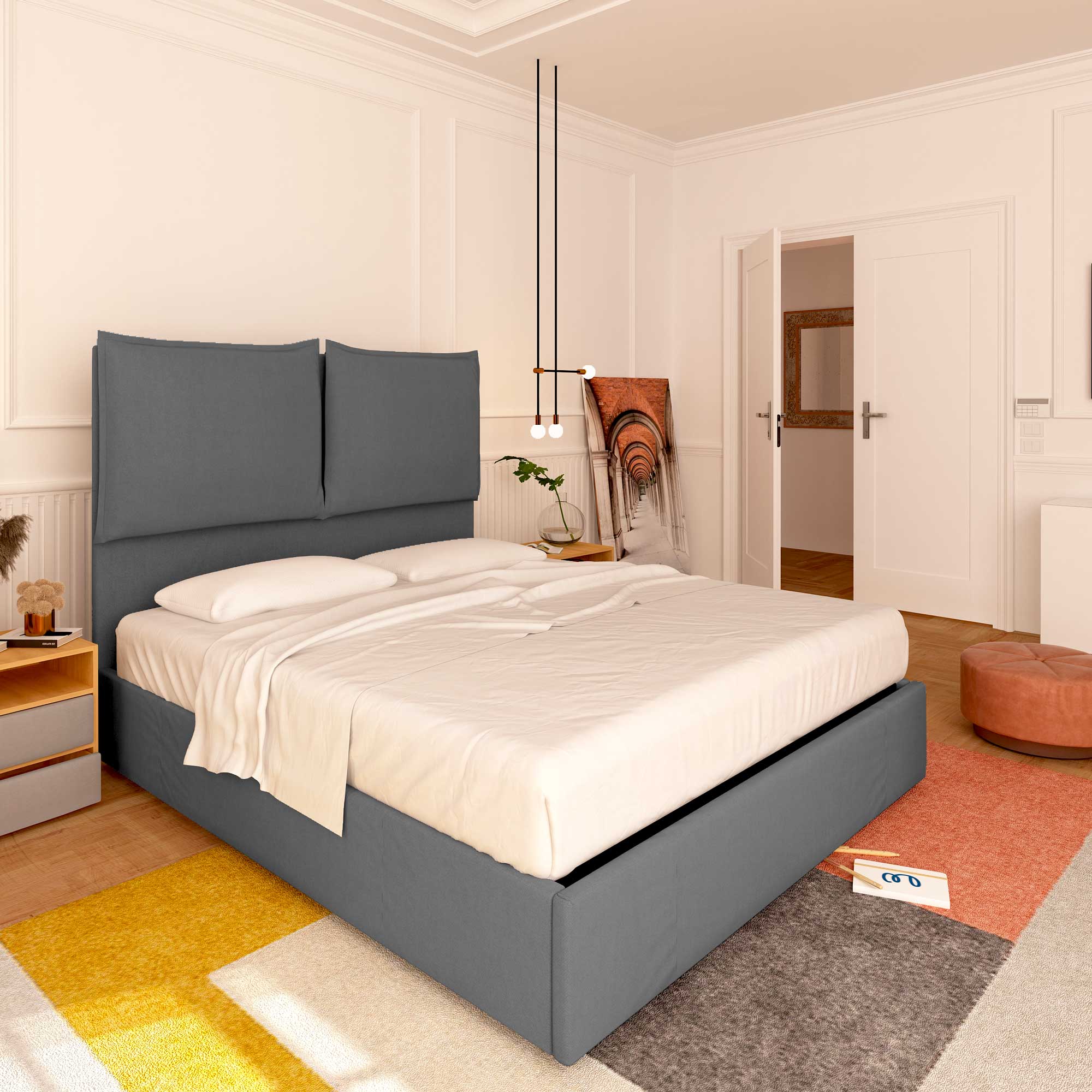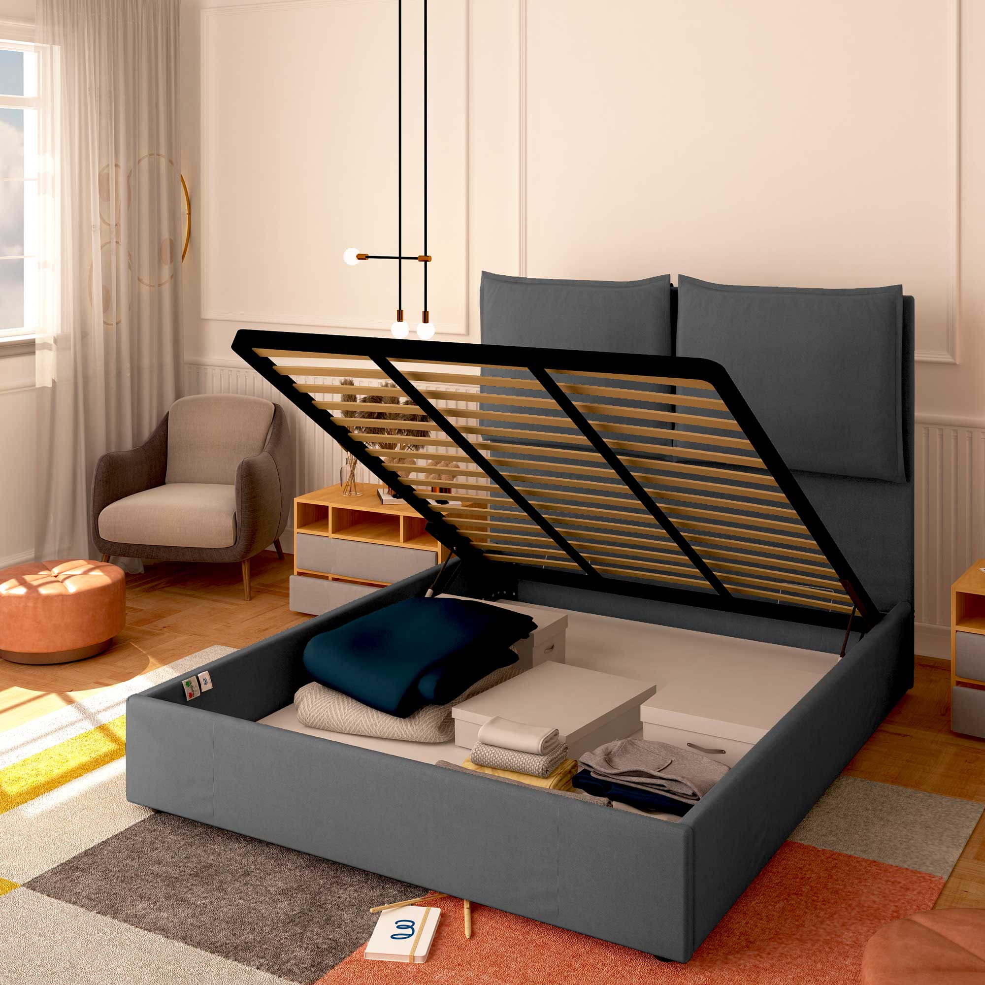 Le lit coffre king size en tissu déhoussable Licia XL permet d'exploiter l'espace sous le lit pour ranger couvertures, draps, couettes, vêtements et boîtes. Le sommier et le matelas se soulèvent facilement grâce à la poignée de prise. Le lit coffre est livré à domicile à monter, accompagné de simples instructions à suivre.
