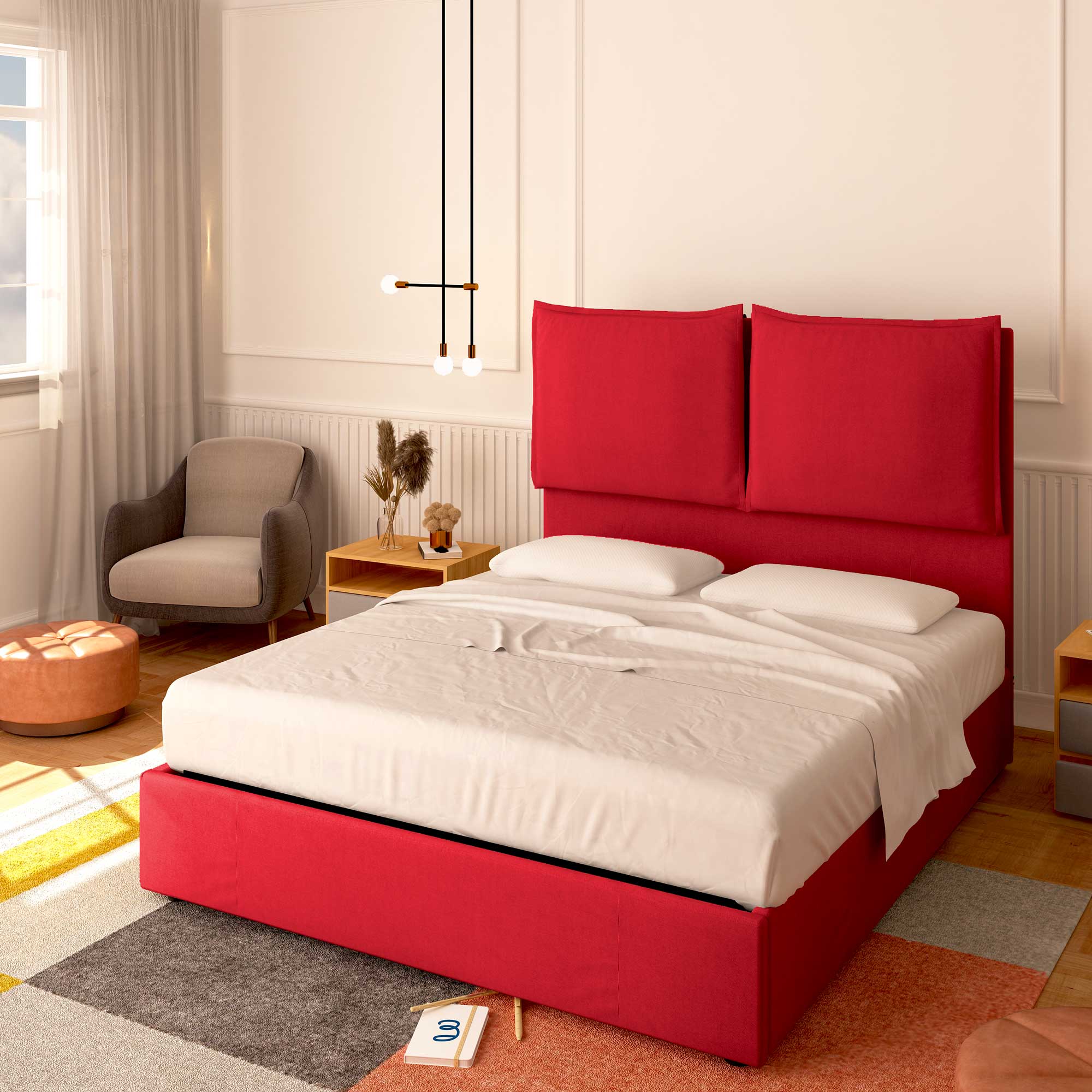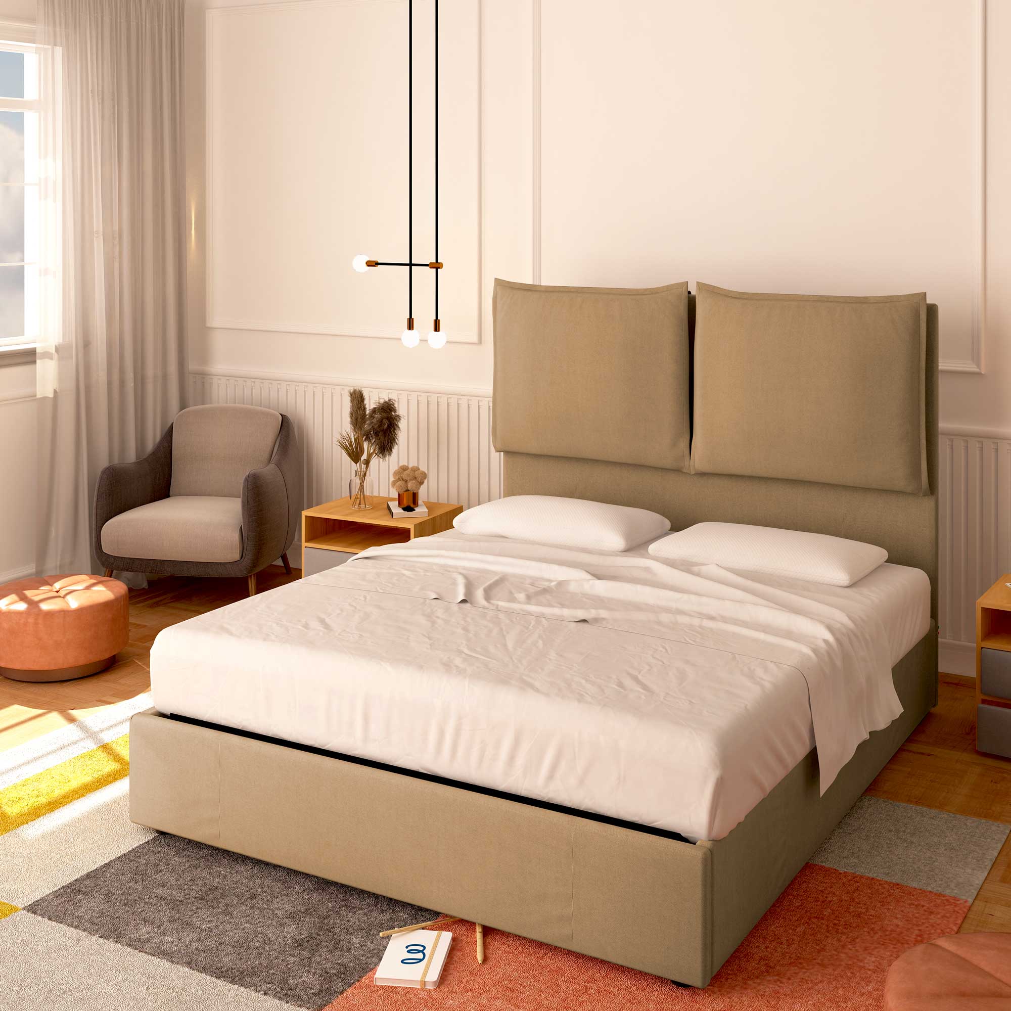 Le lit coffre double en tissu déhoussable Licia XL permet d'exploiter l'espace sous le lit pour ranger couvertures, draps, couettes, vêtements et boîtes. Le sommier et le matelas se soulèvent facilement grâce à la poignée de prise. Le lit coffre est livré à domicile à monter, accompagné de simples instructions à suivre.