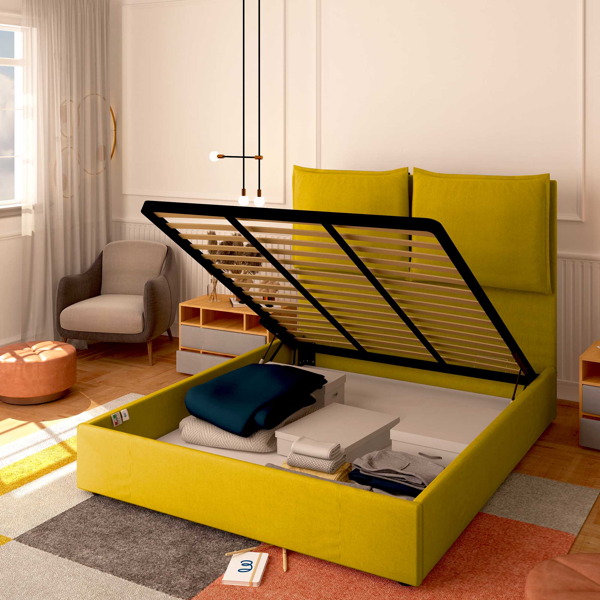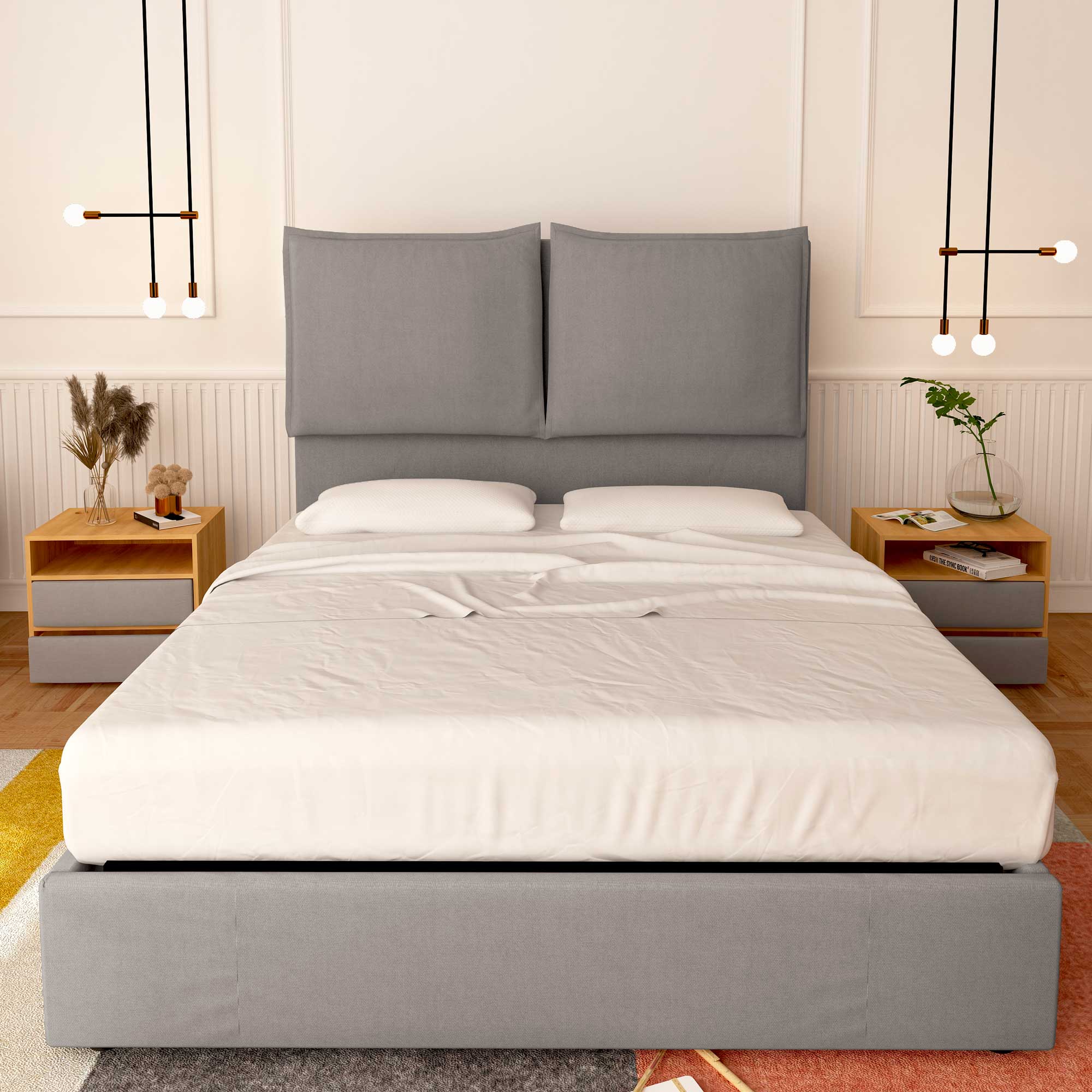 Le lit coffre simple en tissu déhoussable Licia XL permet d'exploiter l'espace sous le lit pour ranger couvertures, draps, couettes, vêtements et boîtes. Le sommier et le matelas se soulèvent facilement grâce à la poignée de prise. Le lit coffre est livré à domicile à monter, accompagné de simples instructions à suivre.
