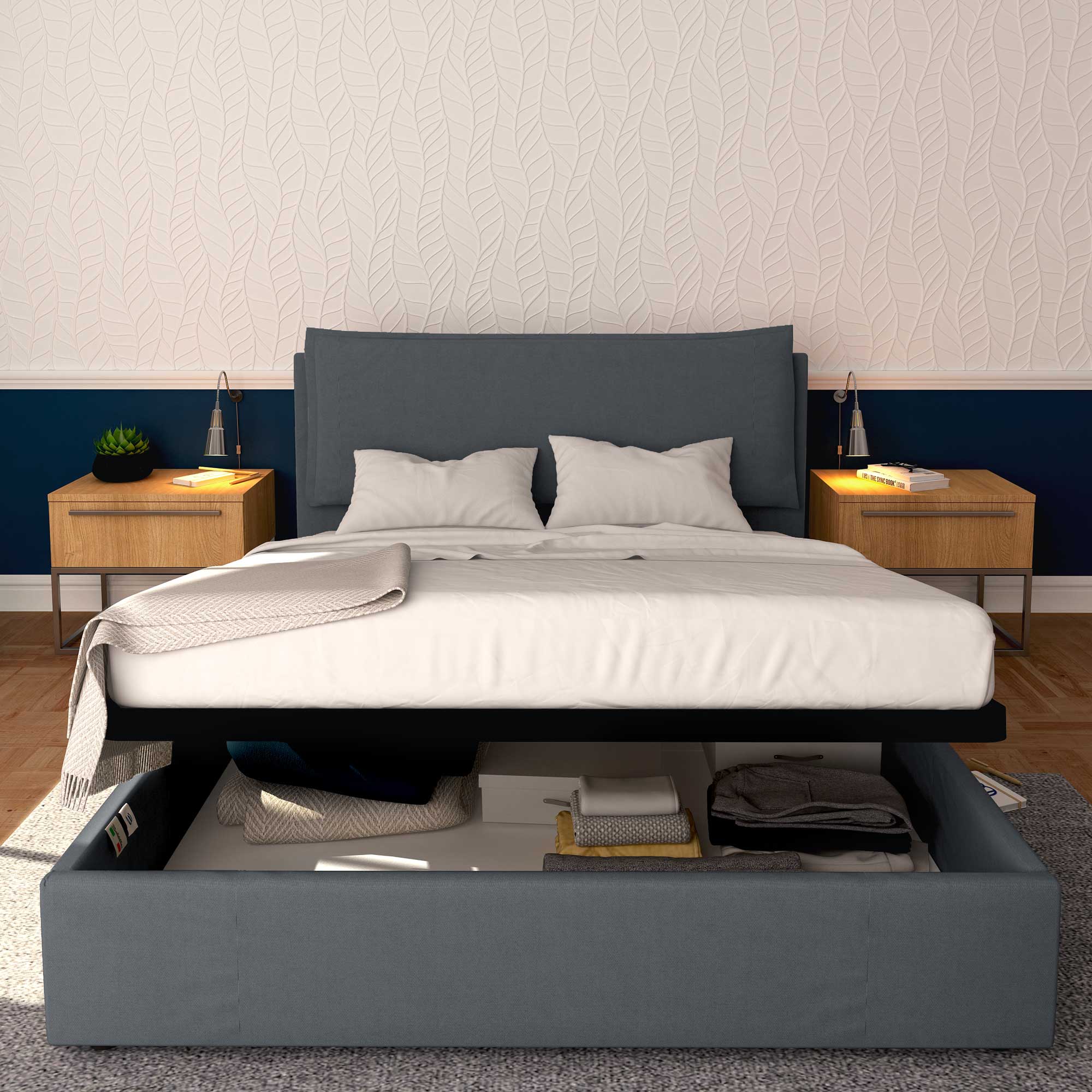 Le lit coffre double en tissu déhoussable Giuliano permet d'exploiter l'espace sous le lit pour ranger couvertures, draps, couettes, vêtements et boîtes. Le sommier et le matelas se soulèvent facilement grâce à la poignée de prise. Le lit coffre est livré à domicile à monter, accompagné de simples instructions à suivre.