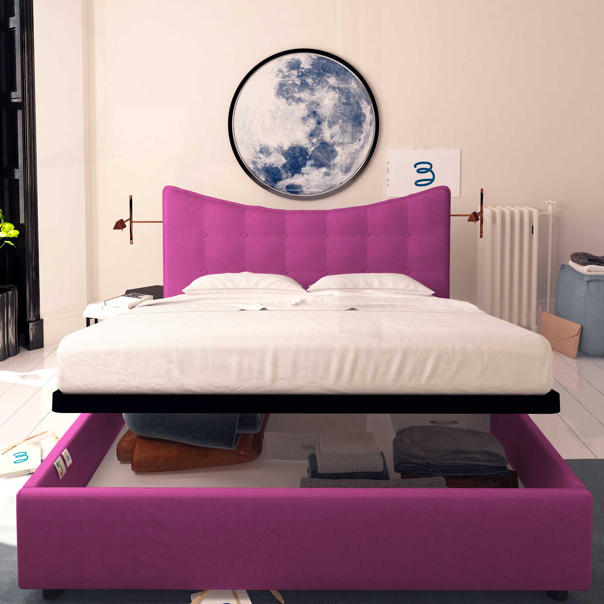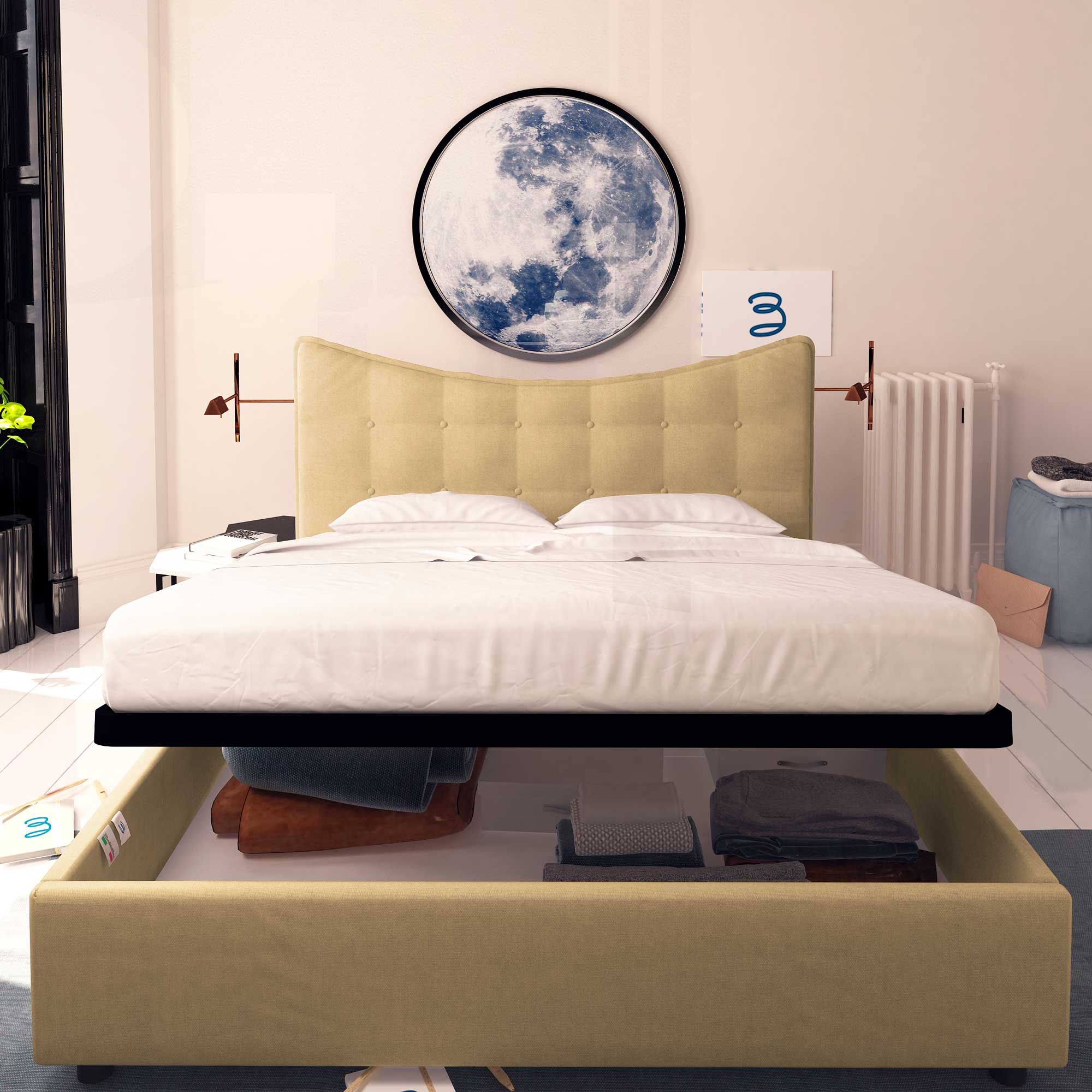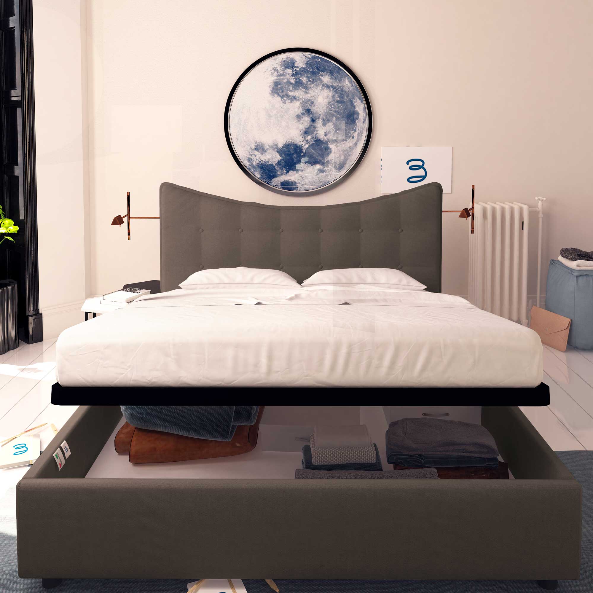 Le lit coffre simple en tissu Moon permet d'exploiter l'espace sous le lit pour ranger couvertures, draps, couettes, vêtements et boîtes. Le sommier et le matelas se soulèvent facilement grâce à la poignée. Le lit coffre est livré à domicile à monter, accompagné de simples instructions à suivre.