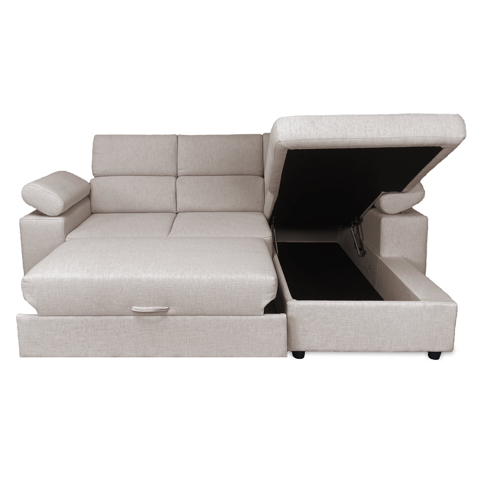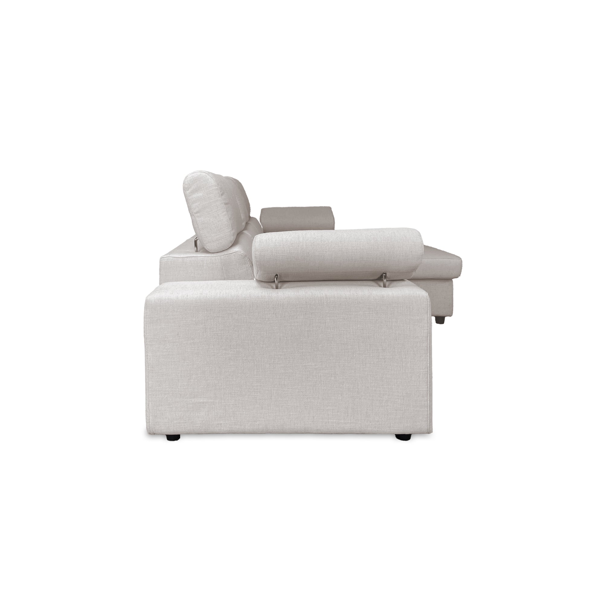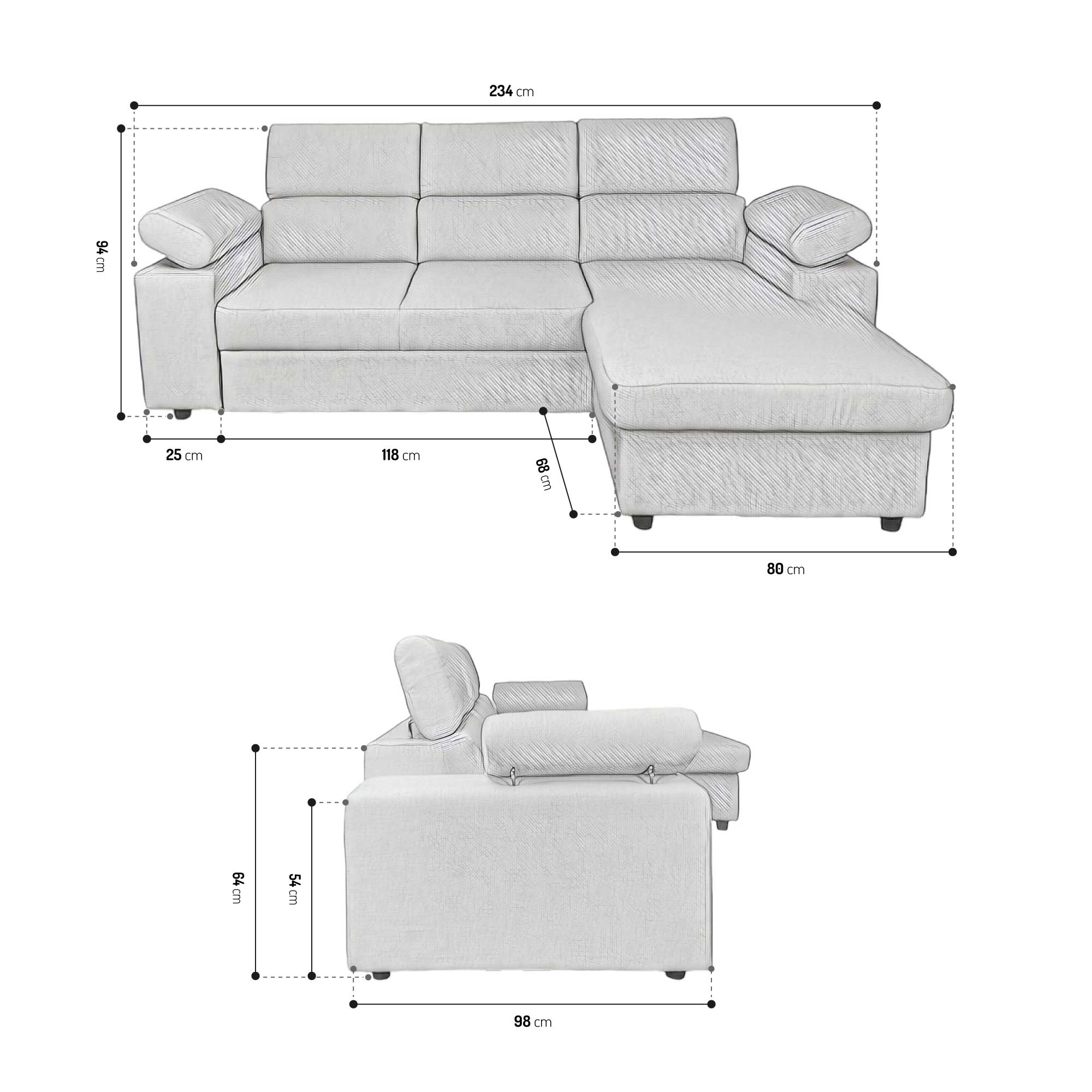 Grazie al meccanismo estraibile, il divano si trasforma rapidamente in un comodo letto matrimoniale, perfetto per accogliere ospiti in totale comodità. La chaise longue laterale, oltre a offrire uno spazio rilassante per distendere le gambe, è dotata di contenitore capiente, ideale per riporre coperte, cuscini o biancheria, mantenendo l’ambiente sempre in ordine.